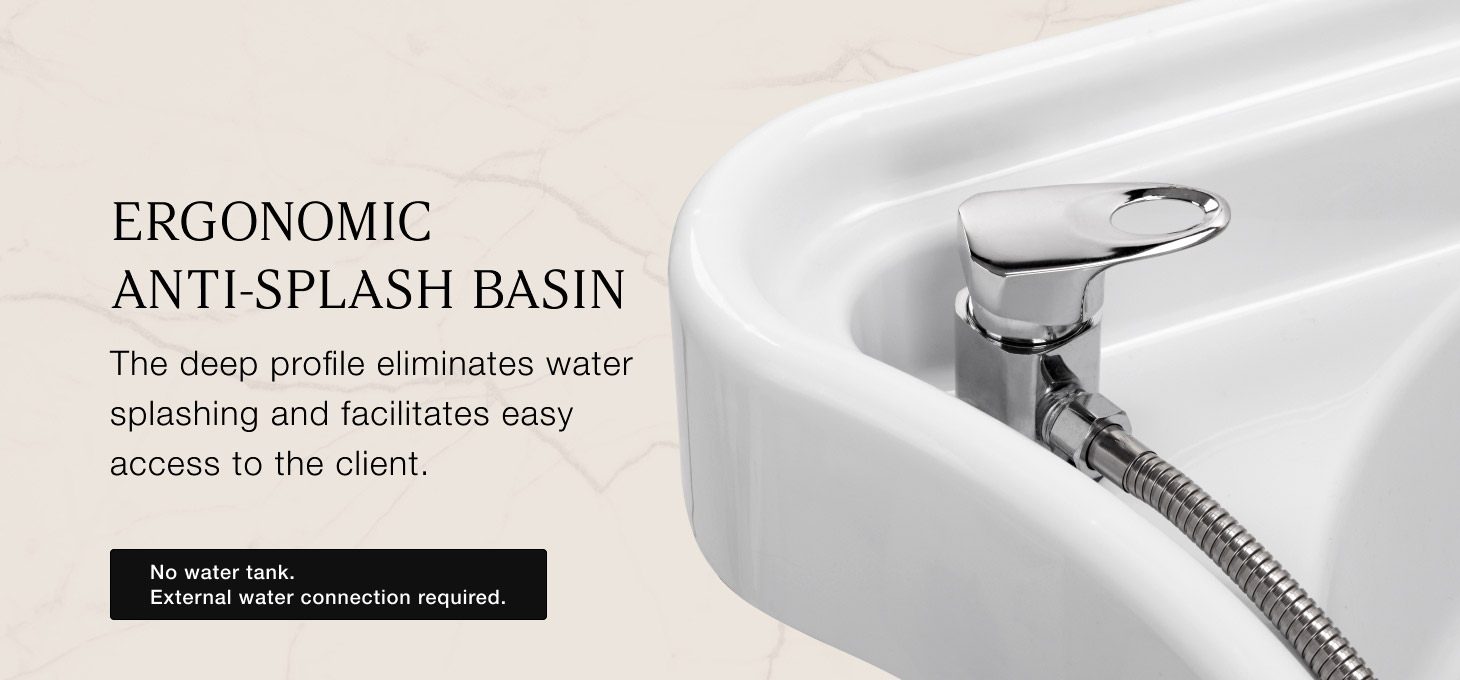 Die tiefe Schale in eleganten Weißtönen wurde für maximalen Komfort sowohl für den Kunden als auch für die Person, die die Behandlung durchführt, entworfen. Sein Design verhindert effektiv Spritzwasser und Kosmetika, was es einfacher macht, den Arbeitsplatz sauber und ordentlich zu halten. Die einzigartige Biegung erleichtert nicht nur den Zugang für die Person, die die Dienstleistung ausführt, sondern verleiht der Waschanlage auch einen eleganten, modernen Charakter. Eine durchdachte Kombination aus Funktion und Stil, die den Standard eines jeden Beauty- und Wellness-Raums erhöht.
