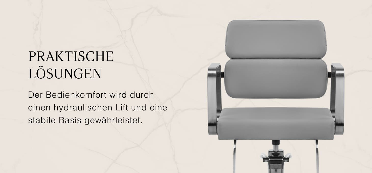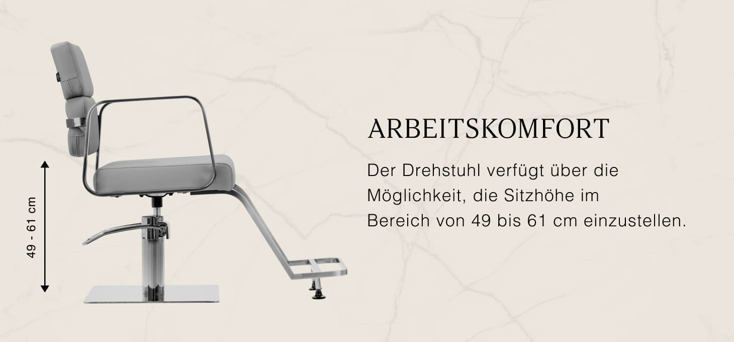 Mit einem langlebigen hydraulischen Lift können Sie das Sitzniveau zwischen 49 und 61 cm verstellen – auch wenn der Kunde auf dem Stuhl sitzt. Es bietet ein ergonomischeres Arbeitserlebnis, da die Sitzhöhe an die Körpergröße des Kunden und des Friseurs angepasst werden kann. Die optisch ansprechende Rückenlehne ermöglicht es Ihnen, eine bequeme Position einzunehmen, die eine hervorragende Rückenstütze bietet, was besonders bei vielen Behandlungsstunden wichtig ist. Ein großes Plus dieses Modells ist das Loch, das zwischen der Rückenlehne und dem Sitz bleibt. Es macht es einfacher, den Salon sauber zu halten, so dass Sie Ihre Haare leicht aus allen Ecken und Winkeln des Stuhls fegen können. Auf diese Weise können Sie die Vorbereitung des Arbeitsplatzes zwischen den Kunden optimieren.