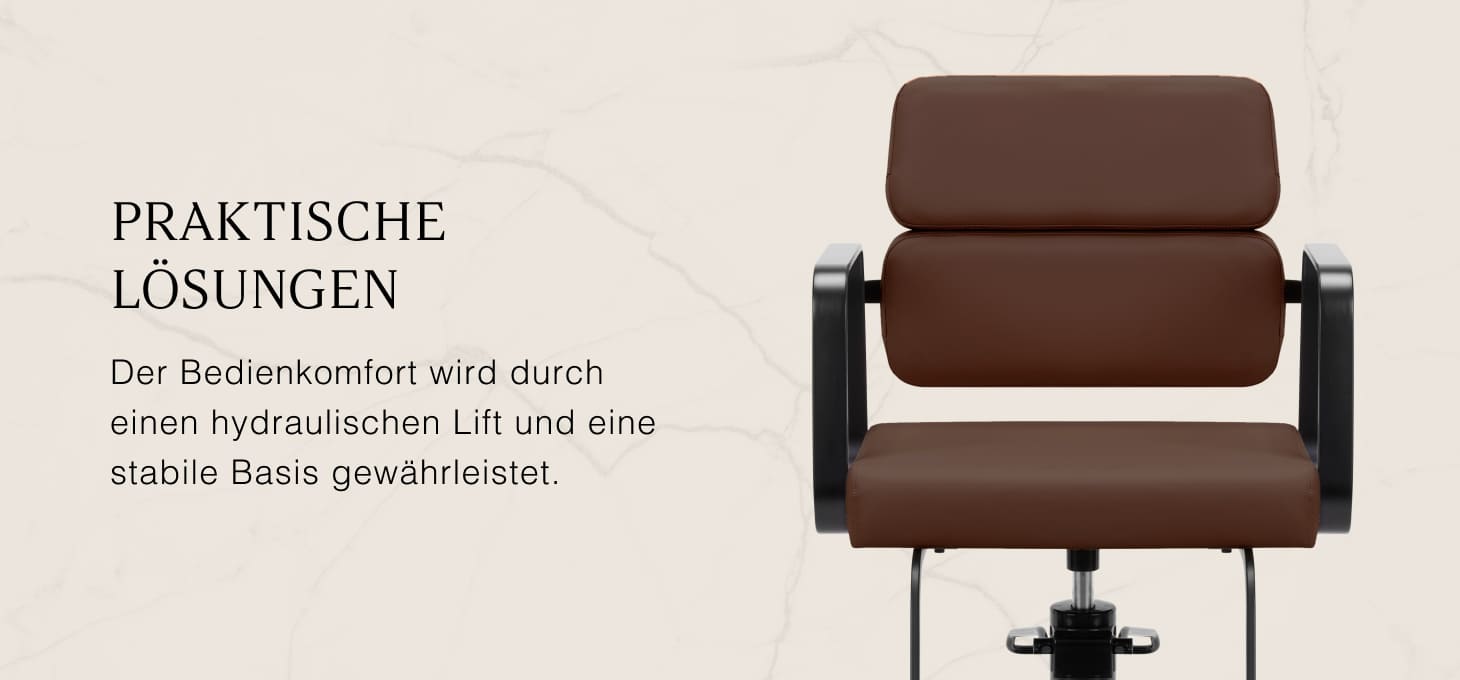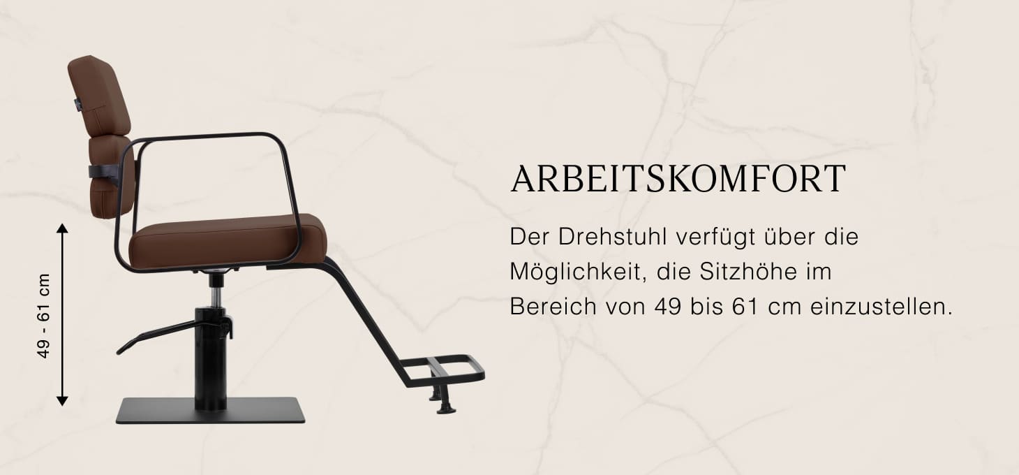 Mit einem langlebigen hydraulischen Lift können Sie das Sitzniveau zwischen 49 und 61 cm verstellen – auch wenn der Kunde auf dem Stuhl sitzt. Es bietet ein ergonomischeres Arbeitserlebnis, da die Sitzhöhe an die Körpergröße des Kunden und des Friseurs angepasst werden kann. Die optisch ansprechende Rückenlehne ermöglicht es Ihnen, eine bequeme Position einzunehmen, die eine hervorragende Rückenstütze bietet, was besonders bei vielen Behandlungsstunden wichtig ist. Ein großes Plus dieses Modells ist das Loch, das zwischen der Rückenlehne und dem Sitz bleibt. Es macht es einfacher, den Salon sauber zu halten, so dass Sie Ihre Haare leicht aus allen Ecken und Winkeln des Stuhls fegen können. Auf diese Weise können Sie die Vorbereitung des Arbeitsplatzes zwischen den Kunden optimieren.