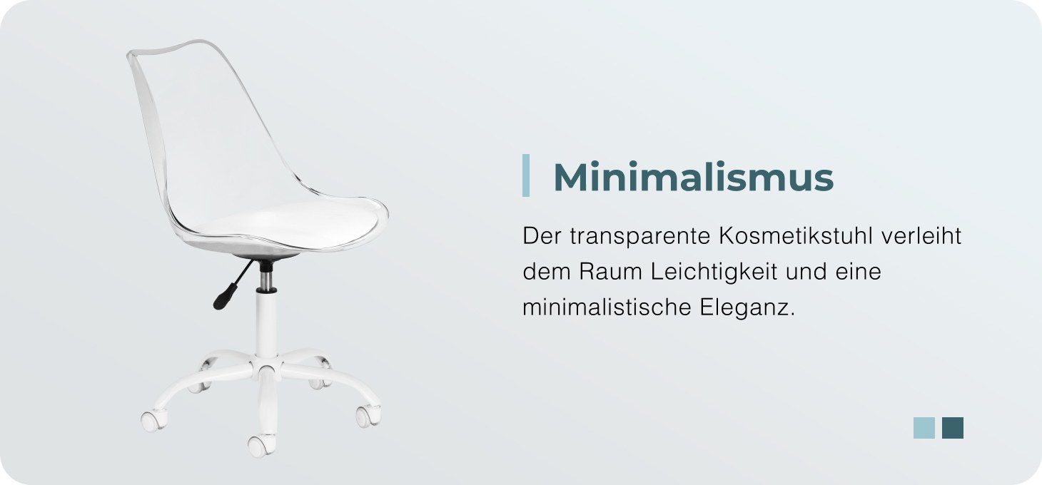 Der transparente Ghost-Kosmetikstuhl mit moderner Form ergänzt den Büroraum perfekt, verleiht ihm Leichtigkeit und einen minimalistischen Charakter. Die transparente Rückenlehne verbindet Ästhetik mit Funktionalität und schafft so einen komfortablen Arbeitsplatz für verschiedene Behandlungsarten.