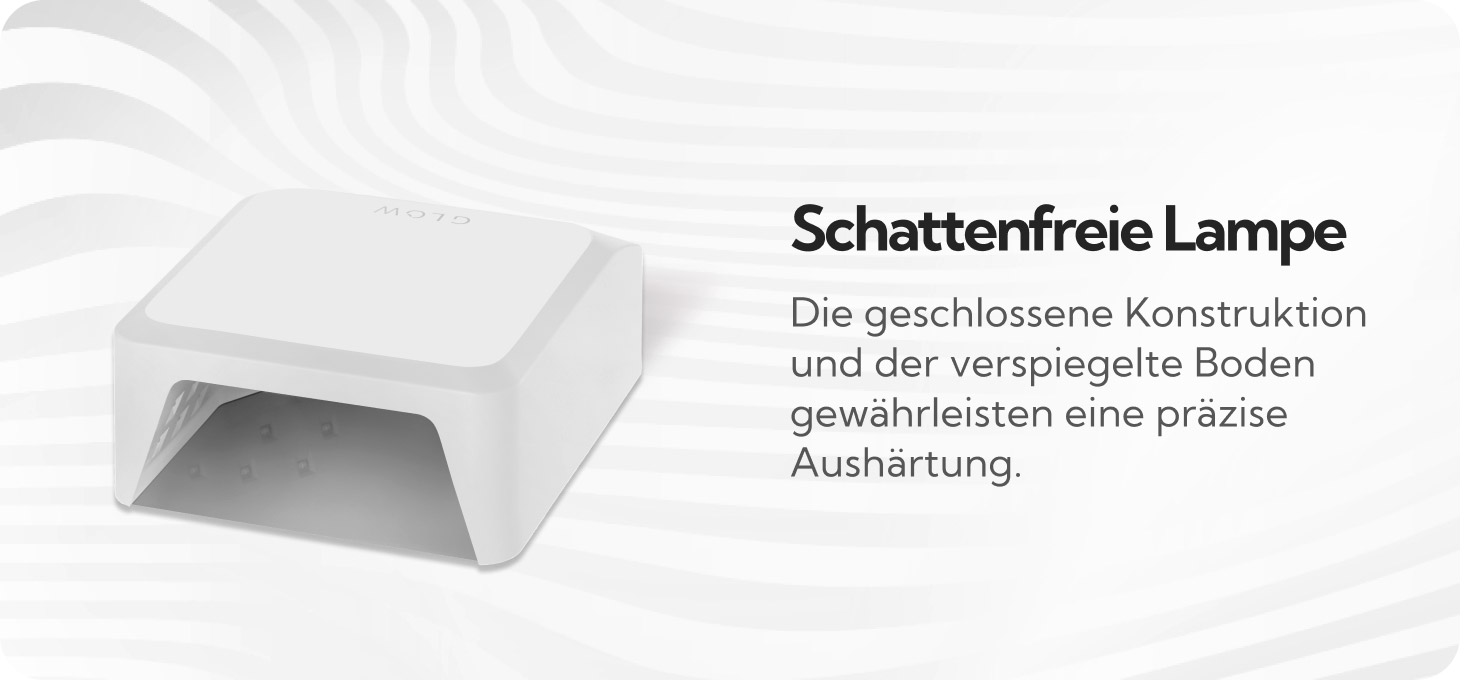 Die schattenlose Lampe mit 39 LEDs härtet gleichmäßig Hybrid-Gele und Polituren aus. Die Konstruktion in Form einer geschlossenen Kabine und eines spiegeligen Bodens, der Licht reflektiert, macht den Aushärtungsprozess schneller und genauer, selbst an schwer zugänglichen Stellen der Nagelplatte. Die Dual-LED-Technologie strahlt Licht in zwei Wellenlängen aus, was die Augenbelastung deutlich reduziert und den Arbeitskomfort erhöht.