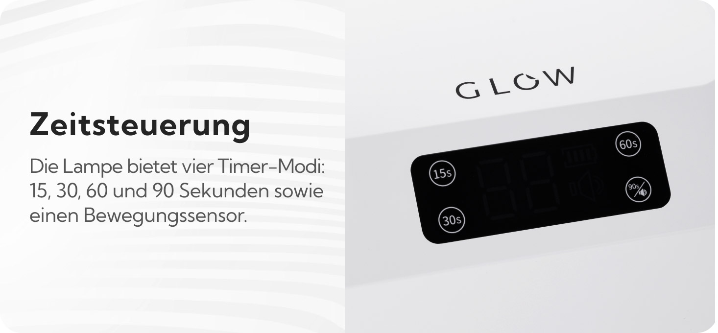 Die Lampe verfügt über einen Timer mit vier voreingestellten Betriebszeiten: 15 Sekunden, 30 Sekunden, 60 Sekunden und 90 Sekunden ("Low Heat Mode"), die auf einem klaren digitalen Bildschirm angezeigt wird. Der eingebaute Bewegungssensor startet das Gerät automatisch, wenn du deine Hand oder deinen Fuß einführst, wobei du die letzte Zeit-Option nutzt. Die Aushärtungszeit ist deutlich auf dem Bildschirm sichtbar, was es Ihnen ermöglicht, die Belichtungslänge präzise an das gewünschte Styling anzupassen.