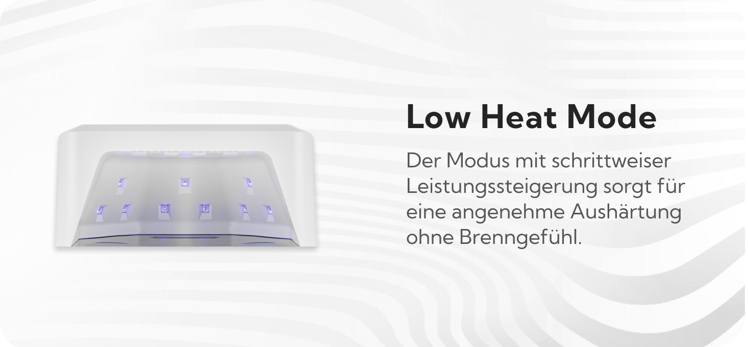 Wenn der Low Heat-Modus aktiviert ist, wird die Lampe allmählich erhitzt und erhöht langsam die Leistung, sodass du dein Styling bequem aushärten kannst, ohne dich brennend oder heiß zu fühlen. Die Funktion funktioniert besonders gut bei Gels, die Unbehagen verursachen können. Das macht den Aushärtungsprozess angenehmer und schützt die Nägel vor übermäßiger Hitze.