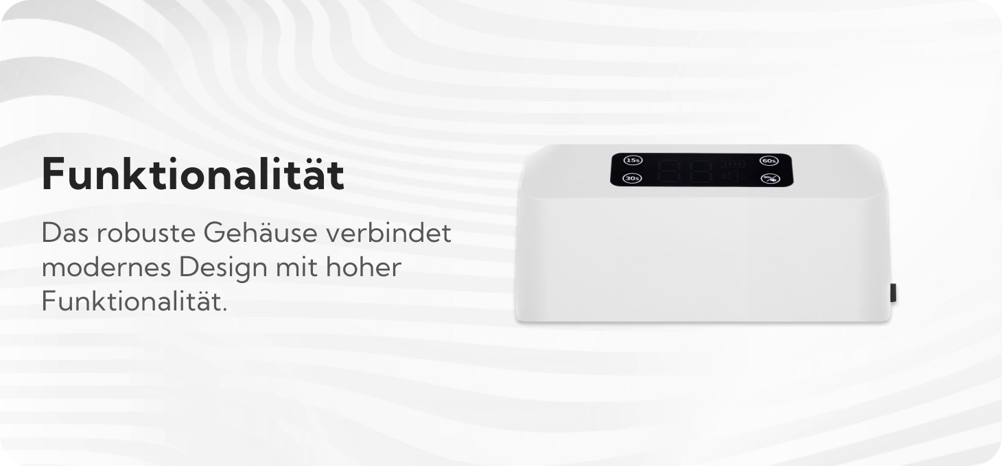 Das Lampengehäuse aus langlebigem Kunststoff verbindet einen modernen, minimalistischen Look mit praktischer Nutzung. Die Lampe ist leicht zu reinigen, beschädigungsresistent und hat Maße, die es ermöglichen, die gesamte Hand oder den Fuß bequem zu positionieren, was sicherstellt, dass das Design schnell und gleichmäßig ausgehärtet wird. Der abnehmbare, magnetische Boden erleichtert die Durchführung von Pediküren sowie die Reinigung und Desinfektion des Geräts, was den Arbeitskomfort und das Hygieneniveau im Salon erhöht.