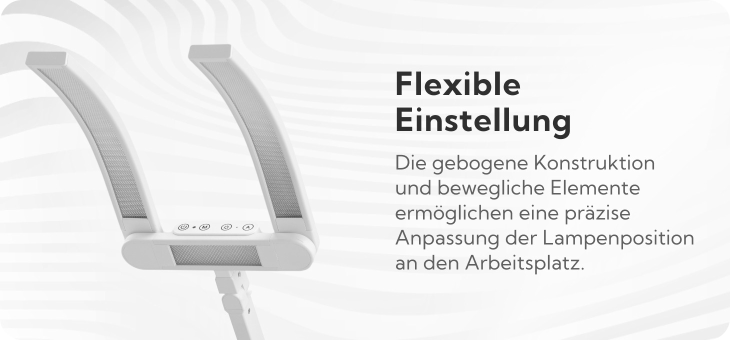 Die beweglichen Elemente von Stativ und Lampenkopf bieten große Freiheit bei der Einstellung der Beleuchtung am Arbeitsplatz, je nach Art der durchgeführten Behandlung. Die Position des Stativs lässt sich dank der vier Gelenke am Arm und der 360° drehbaren Stativbasis leicht verstellen. Solche Lösungen ermöglichen eine präzise Anpassung der Kopfposition an die individuellen Bedürfnisse des Nutzers und garantieren eine optimale Beleuchtung des Arbeitsbereichs sowie einen hohen Arbeitskomfort.