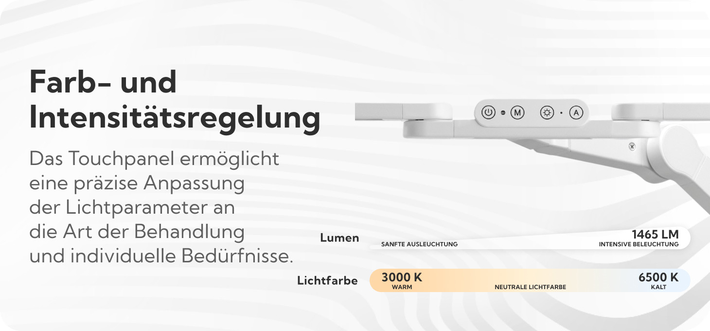 Die Möglichkeit, Farbe und Lichtintensität anzupassen, sorgt für eine ausgezeichnete Wiedergabe der sichtbaren Farben, was die Augenmüdigkeit bei längerer Arbeit reduziert. Farbe und Lichtintensität können schrittweise mit dem Touchpanel am Kopf angepasst werden. Die Anpassung umfasst fünf Farbtemperaturstufen (von kalt über neutral zu warm) und fünf Lichtintensitätsstufen. Nachdem man die Knöpfe lange gedrückt gehalten hat, kann man sie auch unendlich anpassen, was große Möglichkeiten bietet, die Beleuchtung individuell anzupassen. Die Lampe ist außerdem mit einem Lichtsensor ausgestattet, der es ermöglicht, die Lichtintensität automatisch an die Helligkeit der Umgebung anzupassen, was den Arbeitskomfort weiter erhöht.