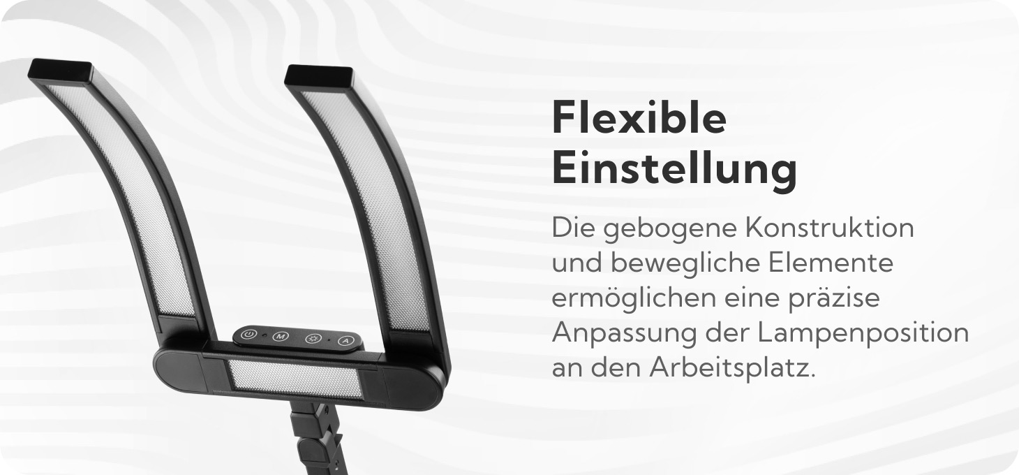 Die Möglichkeit, Farbe und Lichtintensität anzupassen, sorgt für eine ausgezeichnete Wiedergabe der sichtbaren Farben, was die Augenmüdigkeit bei längerer Arbeit reduziert. Farbe und Lichtintensität können schrittweise mit dem Touchpanel am Kopf angepasst werden. Die Anpassung umfasst fünf Farbtemperaturstufen (von kalt über neutral zu warm) und fünf Lichtintensitätsstufen. Nachdem man die Knöpfe lange gedrückt gehalten hat, kann man sie auch unendlich anpassen, was große Möglichkeiten bietet, die Beleuchtung individuell anzupassen. Die Lampe ist außerdem mit einem Lichtsensor ausgestattet, der es ermöglicht, die Lichtintensität automatisch an die Helligkeit der Umgebung anzupassen, was den Arbeitskomfort weiter erhöht.