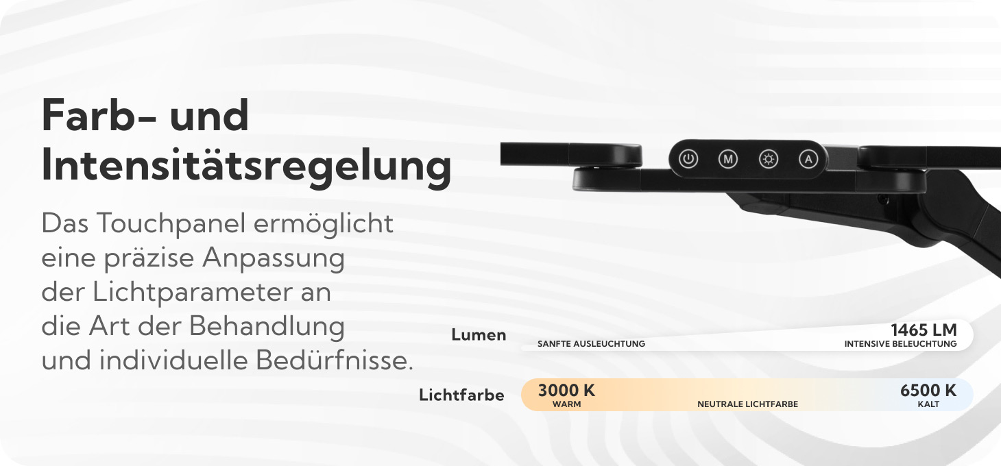 Die beweglichen Elemente von Stativ und Lampenkopf bieten große Freiheit bei der Einstellung der Beleuchtung am Arbeitsplatz, je nach Art der durchgeführten Behandlung. Die Position des Stativs lässt sich dank der vier Gelenke am Arm und der 360° drehbaren Stativbasis leicht verstellen. Solche Lösungen ermöglichen eine präzise Anpassung der Kopfposition an die individuellen Bedürfnisse des Nutzers und garantieren eine optimale Beleuchtung des Arbeitsbereichs sowie einen hohen Arbeitskomfort.