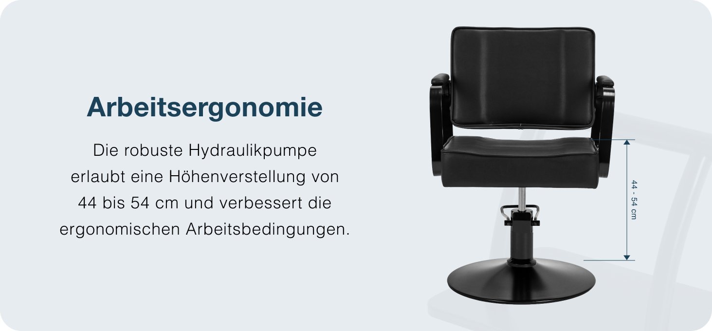 Der robuste hydraulische Hebelift ermöglicht es, die Sitzhöhe zwischen 44 und 54 cm einzustellen – selbst wenn der Kunde im Stuhl sitzt. Dies erleichtert ergonomische Arbeit und ermöglicht es dem Friseur, die Höhe an seine Bedürfnisse und die Körpergröße des Kunden anzupassen. Die profilierte Rückenlehne sorgt für stabile Rückenstütze, was besonders für längere Behandlungen wichtig ist. Seine Form ermöglicht freien Zugang zu Hals, Nacken und Haaransatz und unterstützt präzises Schneiden, Styling und Färben.