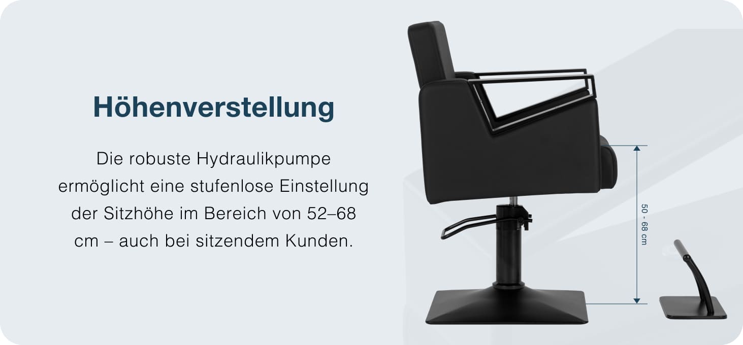 Der robuste hydraulische Hebelift ermöglicht es, die Sitzhöhe von 52 auf 68 cm einzustellen, selbst wenn der Kunde im Stuhl sitzt. Dies macht die Arbeit des Friseurs ergonomischer, und die Höhe des Stuhls kann sowohl an die Höhe des Kunden als auch des Spezialisten angepasst werden. Eine richtig profilierte Rückenlehne sorgt für eine bequeme Position, was besonders für längere Behandlungen wichtig ist. Zusätzlich ist der Stuhl mit einer eingebauten Fußstütze mit rutschfester Basis ausgestattet, die die Füße des Kunden stabil stützt und während des gesamten Dienstes Komfort gewährleistet.