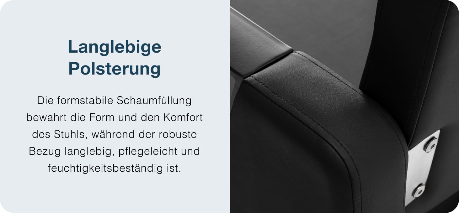 Der stabile, quadratische Sockel des Stuhls garantiert Stabilität während der Benutzung, und seine glatte Oberfläche macht ihn einfach sauber. Die optisch ansprechenden und ergonomisch gestalteten Armlehnen sind in der richtigen Höhe platziert, sodass der Kunde die Schultern richtig positionieren kann – er vergräbt den Kopf nicht in die Schultern oder lehnt sich nicht zusammen. Dank dessen verlaufen Behandlungen, einschließlich Haarschnitte, effizienter, und der Friseur hat die Möglichkeit, präzise zu arbeiten, um den Komfort des Kunden in jeder Phase der Behandlung zu gewährleisten.
