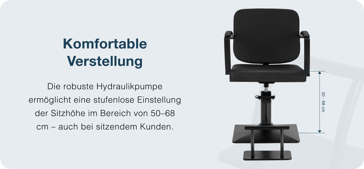 Der robuste hydraulische Hebelift sorgt dafür, dass die Sitzhöhe auch während der Nutzung von 50 auf 68 cm eingestellt wird, was es ermöglicht, den Stuhl ergonomisch entsprechend der Höhe des Kunden und des Spezialisten zu positionieren. Eine richtig profilierte Rückenlehne sorgt für eine bequeme Position, was besonders für längere Behandlungen wichtig ist. Zusätzlich ist der Stuhl mit einer angepassten Fußstütze mit rutschfester Basis ausgestattet, die die Füße des Kunden stabil stützt und während der gesamten Behandlung den Komfort erhöht.