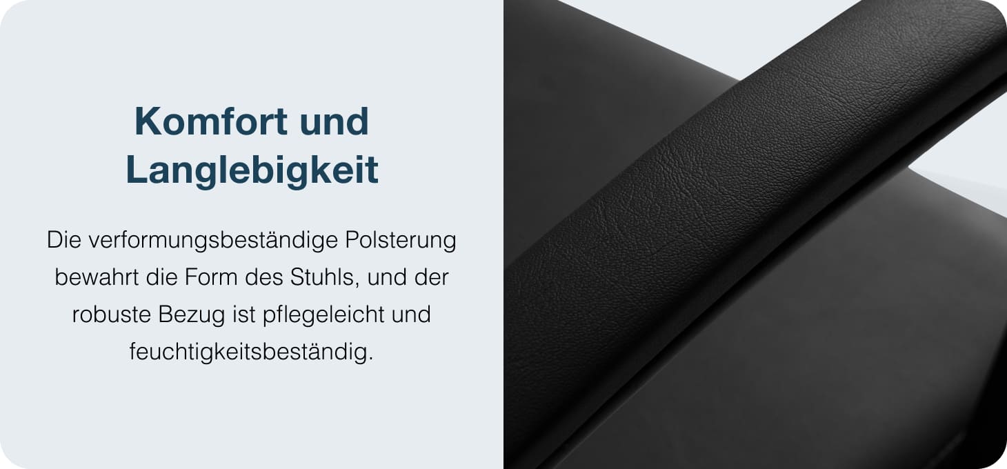 Der Sitz ist mit langlebigem, deformationsresistentem Schaum gefüllt, dank dessen Stuhl seine Form und volle Funktionalität lange behält. Die Polsterung aus Kunstleder ist angenehm anzufühlen, feuchtigkeitsbeständig, sehr haltbar und leicht zu reinigen. Das tiefe Schwarz der Polsterung trägt zu seiner zeitlosen Eleganz bei. Das klassische Finish lässt den Sessel in fast jedem Raum großartig aussehen und betont den Stil des Salons.
