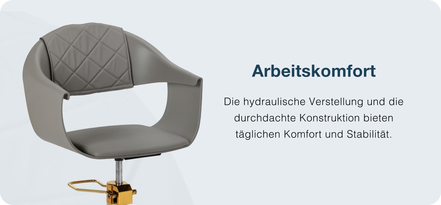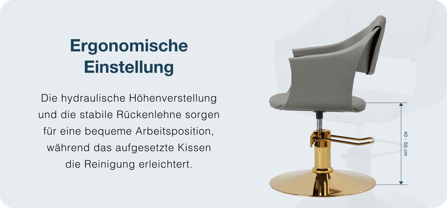 Der robuste hydraulische Wagenheber ermöglicht es, die Sitzhöhe innerhalb von 40–50 cm einzustellen – sogar während der Benutzung. Dadurch kann der Stuhl auf die Höhe und die Vorlieben des Kunden eingestellt werden, was eine ergonomische Arbeitsposition unterstützt. Die Rückenlehne bietet stabile Rückenstütze, was besonders bei langen Behandlungen nützlich ist. Für zusätzlichen Komfort ist der Sessel mit einem synthetischen Lederkissen und einem Velcro-Polster ausgestattet, das an der Rückenlehne angebracht wird – eine Lösung, die Reinigung und Wartung erleichtert.