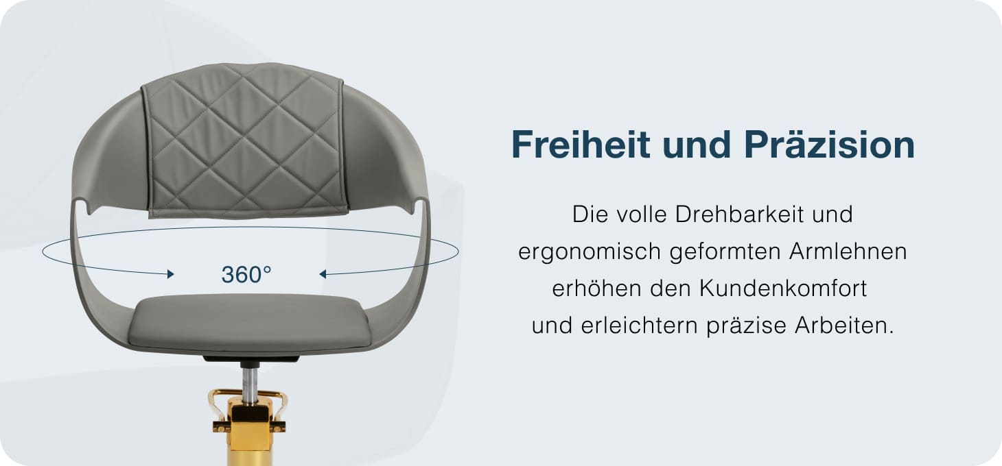 Der Stuhl ist mit einem vollständigen Schwenkmechanismus ausgestattet, der dem Friseur während der Arbeit Bewegungsfreiheit und Komfort bietet. Kunststoffarmlehnen, die in der richtigen Höhe platziert sind, ermöglichen es, die Schultern des Kunden korrekt zu positionieren und verhindern so das Hängen und Neigen des Kopfes. Das ergonomische Design erleichtert präzise Behandlungen, und die solide Oberfläche erhöht die Haltbarkeit des Stuhls sowie den Gebrauchskomfort – sowohl bei kürzeren als auch bei längeren Dienstleistungen.