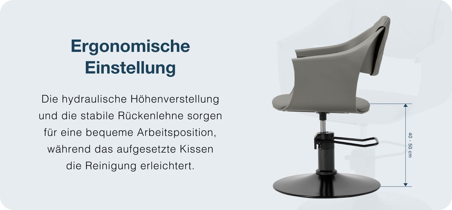 Der robuste hydraulische Wagenheber ermöglicht es, die Sitzhöhe innerhalb von 40–50 cm einzustellen – sogar während der Benutzung. Dadurch kann der Stuhl auf die Höhe und die Vorlieben des Kunden eingestellt werden, was eine ergonomische Arbeitsposition unterstützt. Die Rückenlehne bietet stabile Rückenstütze, was besonders bei langen Behandlungen nützlich ist. Für zusätzlichen Komfort ist der Sessel mit einem synthetischen Lederkissen und einem Velcro-Polster ausgestattet, das an der Rückenlehne angebracht wird – eine Lösung, die Reinigung und Wartung erleichtert.