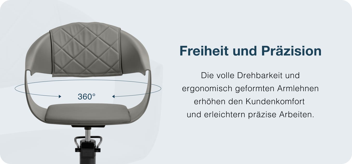 Der Stuhl ist mit einem vollständigen Schwenkmechanismus ausgestattet, der dem Friseur während der Arbeit Bewegungsfreiheit und Komfort bietet. Kunststoffarmlehnen, die in der richtigen Höhe platziert sind, ermöglichen es, die Schultern des Kunden korrekt zu positionieren und verhindern so das Hängen und Neigen des Kopfes. Das ergonomische Design erleichtert präzise Behandlungen, und die solide Oberfläche erhöht die Haltbarkeit des Stuhls sowie den Gebrauchskomfort – sowohl bei kürzeren als auch bei längeren Dienstleistungen.