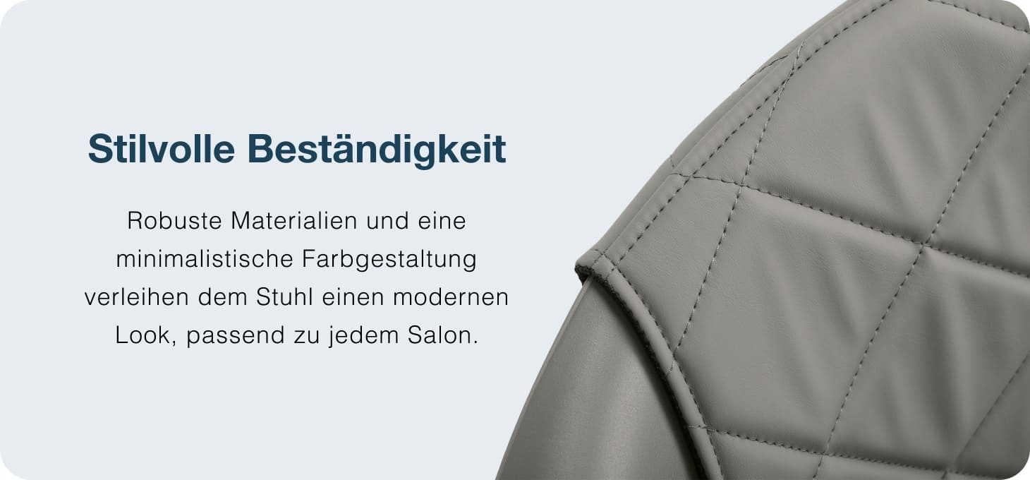 Die langlebige Kunststoffkonstruktion in Grautönen sorgt für Haltbarkeit. Die verwendeten Materialien machen die Geräte angenehm zu bedienen, feuchtigkeitsresistent und leicht zu reinigen. Der runde Sockel in Schwarztönen garantiert Stabilität und Haltbarkeit. Minimalistisches Grau kombiniert mit ästhetischen Nähten und dem Schwarz des Sockels sorgt dafür, dass der Sessel perfekt zu verschiedenen Stilen von Friseursalon-Innenräumen passt und einen eleganten und modernen Akzent einführt.