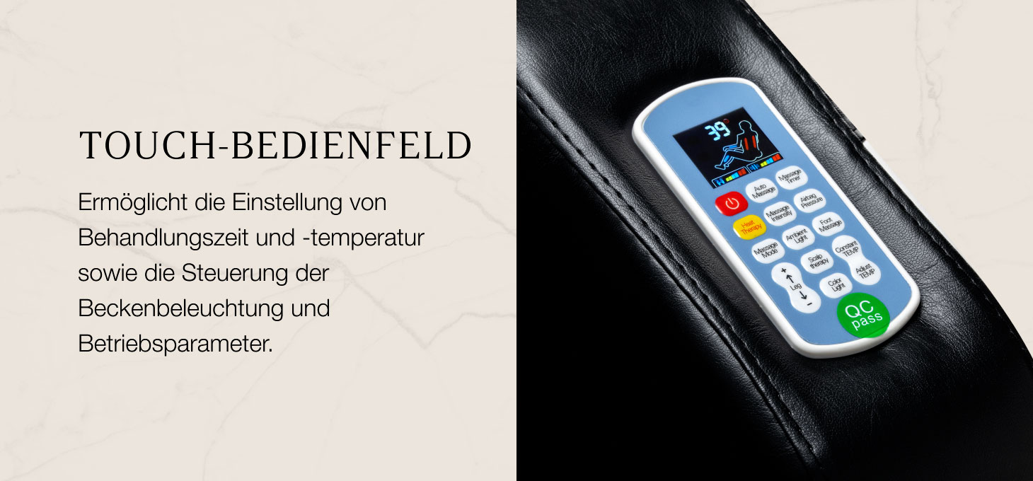 Das Bedienfeld an der Rückseite der rechten Armlehne gewährleistet dem Spezialisten eine bequeme und vollständige Kontrolle über die Behandlungsparameter. Es ermöglicht die Regelung der Wassertemperatur im geschlossenen Kreislauf im Bereich von 30–50 °C sowie die laufende Überwachung des Wertes auf einem gut lesbaren Display, wodurch die Einstellungen präzise an die Bedürfnisse des Kunden angepasst werden können. Über das Bedienfeld lässt sich auch die Lichttherapie in Form einer Beleuchtung der Wanne aktivieren, die eine entspannende Atmosphäre schafft und den luxuriösen Charakter der Behandlung unterstreicht. Über das Bedienfeld kann die Intensität der Massage angepasst, die Rückenheizfunktion aktiviert und die Dauer der Massage ausgewählt werden – standardmäßig auf 20 Minuten eingestellt, mit der Möglichkeit, diese auf 10, 15, 20 oder 40 Minuten einzustellen. Das System bietet drei Intensitätsstufen für die Massage durch die Köpfe sowie drei Stufen für die Druckmassage mit Luftkissen, wodurch die Wirkung des Geräts präzise an die individuellen Vorlieben des Kunden angepasst werden kann.