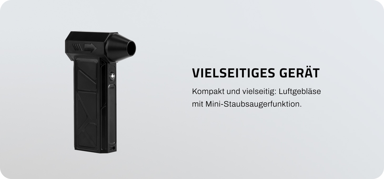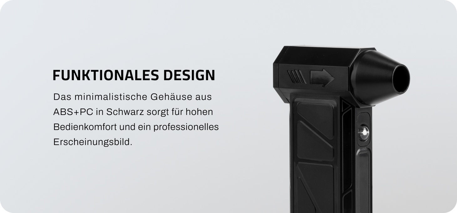 Das Mini-Gebläse verfügt über einen leistungsstarken bürstenlosen Motor und eine effiziente Turbine, die einen starken Luftstrom garantieren. Das Gerät leitet Wärme effektiv ab und sorgt so für einen langanhaltenden und stabilen Betrieb, während hochwertige Komponenten Zuverlässigkeit im täglichen Gebrauch gewährleisten.