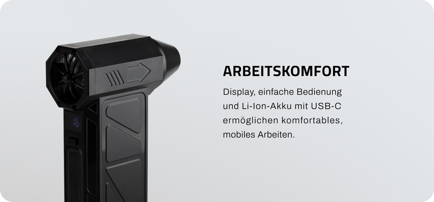 Ein kleines Display auf der Rückseite zeigt den aktuellen Betriebsmodus und den Ladezustand des Akkus an, und durch zweimaliges Drücken der Taste wird die LED-Hintergrundbeleuchtung aktiviert. Durch längeres Gedrückthalten lässt sich das Gerät ausschalten, was die Bedienung erleichtert und die Sicherheit im Gebrauch erhöht. Die leichte und kompakte Bauweise sorgt für bequemen Transport, und der integrierte Li-Ionen-Akku garantiert uneingeschränkten Arbeitskomfort. Das Aufladen über den praktischen USB-C-Anschluss erhöht den Komfort im täglichen Gebrauch. Das Ganze verbindet hohe Leistung mit Mobilität und Funktionalität.