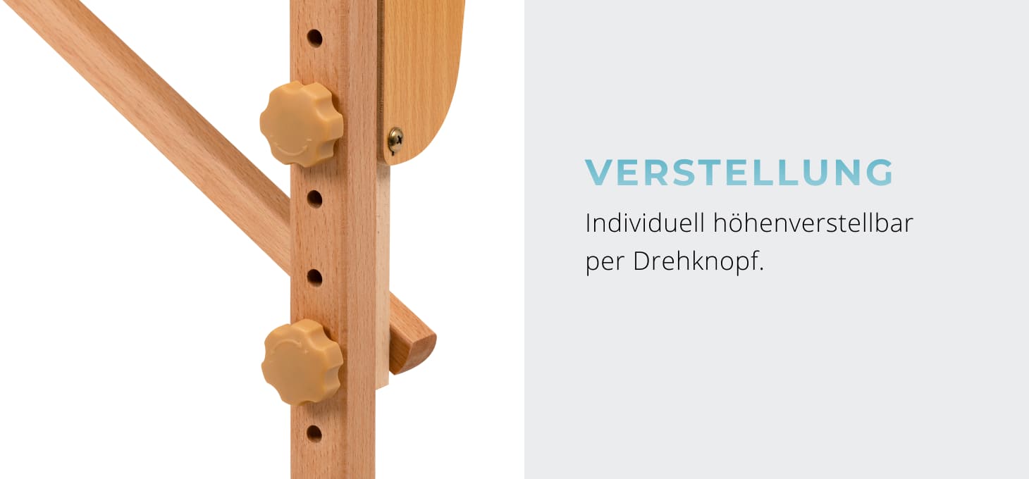 Die Höhe des Tisches lässt sich mithilfe der an den Tischbeinen angebrachten Drehknäufe im Bereich von 62–92 cm an die Körpergröße und individuellen Bedürfnisse der behandelnden Person anpassen. Jedes Bein besteht aus zwei aufeinander abgestimmten Elementen. Nach der Wahl der passenden Höhe müssen die Elemente lediglich in die entsprechenden Öffnungen eingeschraubt werden, damit der Tisch stabil steht. Zudem wird die Rahmenkonstruktion durch Metallseile stabilisiert, wodurch der Massagetisch robust ist und sich ideal für ein breites Spektrum an Behandlungen eignet.