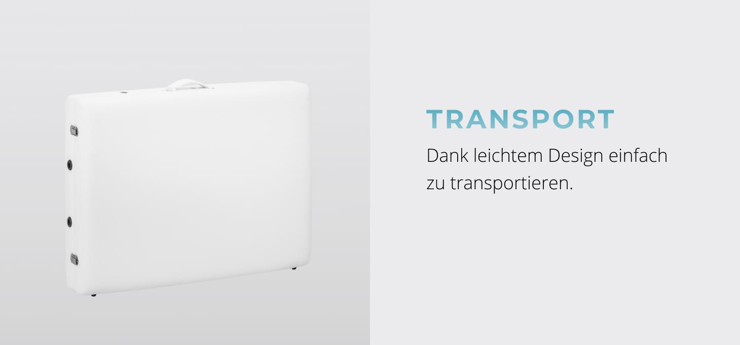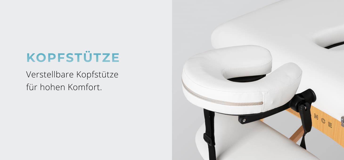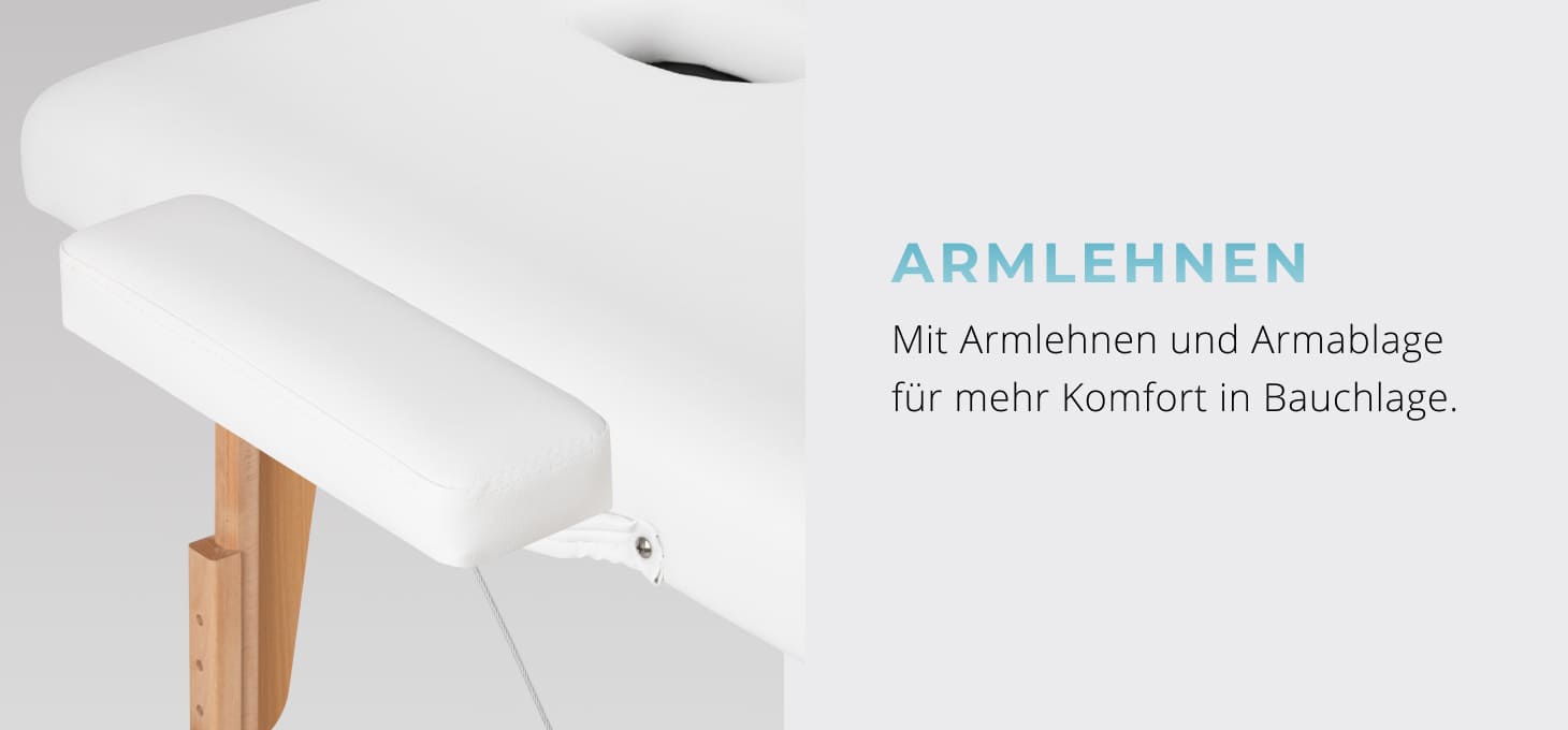 Lieferumfang: Massageliege, Armlehnen, verstellbare Kopfstütze, Armablage vorne, Endkappe, Tragetasche.