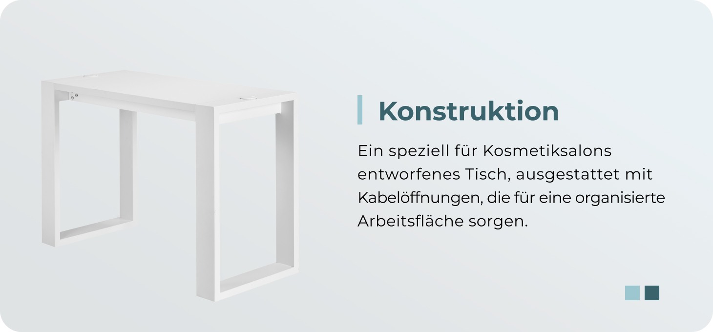 Die universelle weiße Farbgebung und der minimalistische Stil ermöglichen eine mühelose Anpassung an jedes Saloninterieur. Die verwendeten Materialien verleihen dem Möbelstück ein modernes Erscheinungsbild und sorgen gleichzeitig für Langlebigkeit und einfache Reinigung. Die minimalistische Form macht den Tisch zu einem ästhetischen Element, das die Schlichtheit und Eleganz kosmetischer Räume betont.