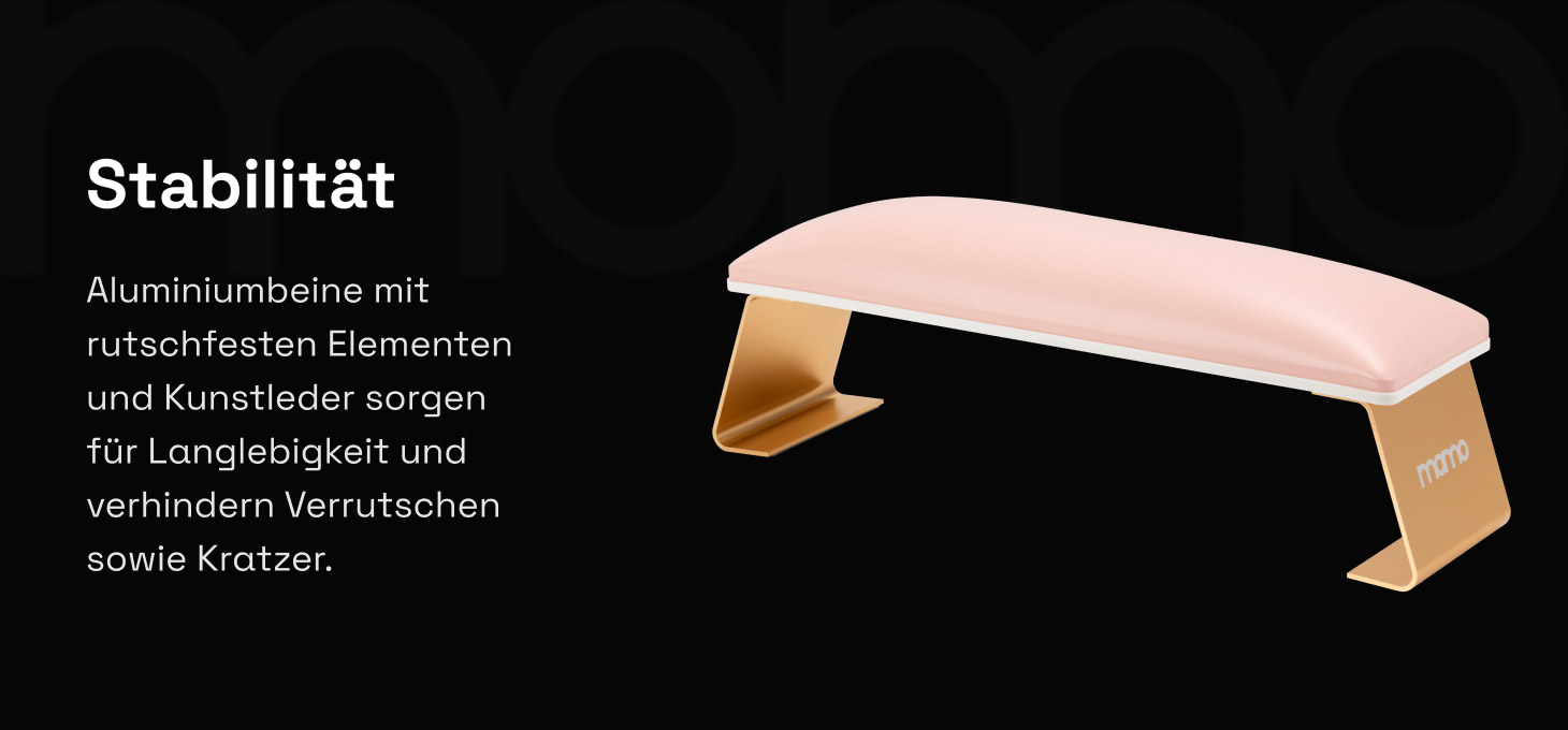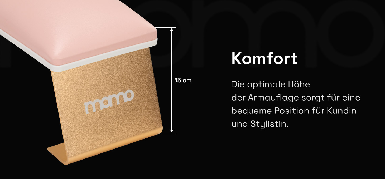 Eine stabile Handstütze erleichtert die präzise Durchführung der Behandlung und das freie Bewegen der Hand der Kundin, was zu einem höheren Behandlungskomfort und einer höheren Arbeitseffizienz führt. Eine richtig gewählte Höhe der Stütze fördert eine bequeme Haltung sowohl für die Kundin als auch für die Stylistin. Die ergonomische Handhaltung hilft, Verspannungen im Rücken- und Wirbelsäulenbereich zu reduzieren und sorgt so für Arbeitskomfort auch bei stundenlangen Behandlungen.