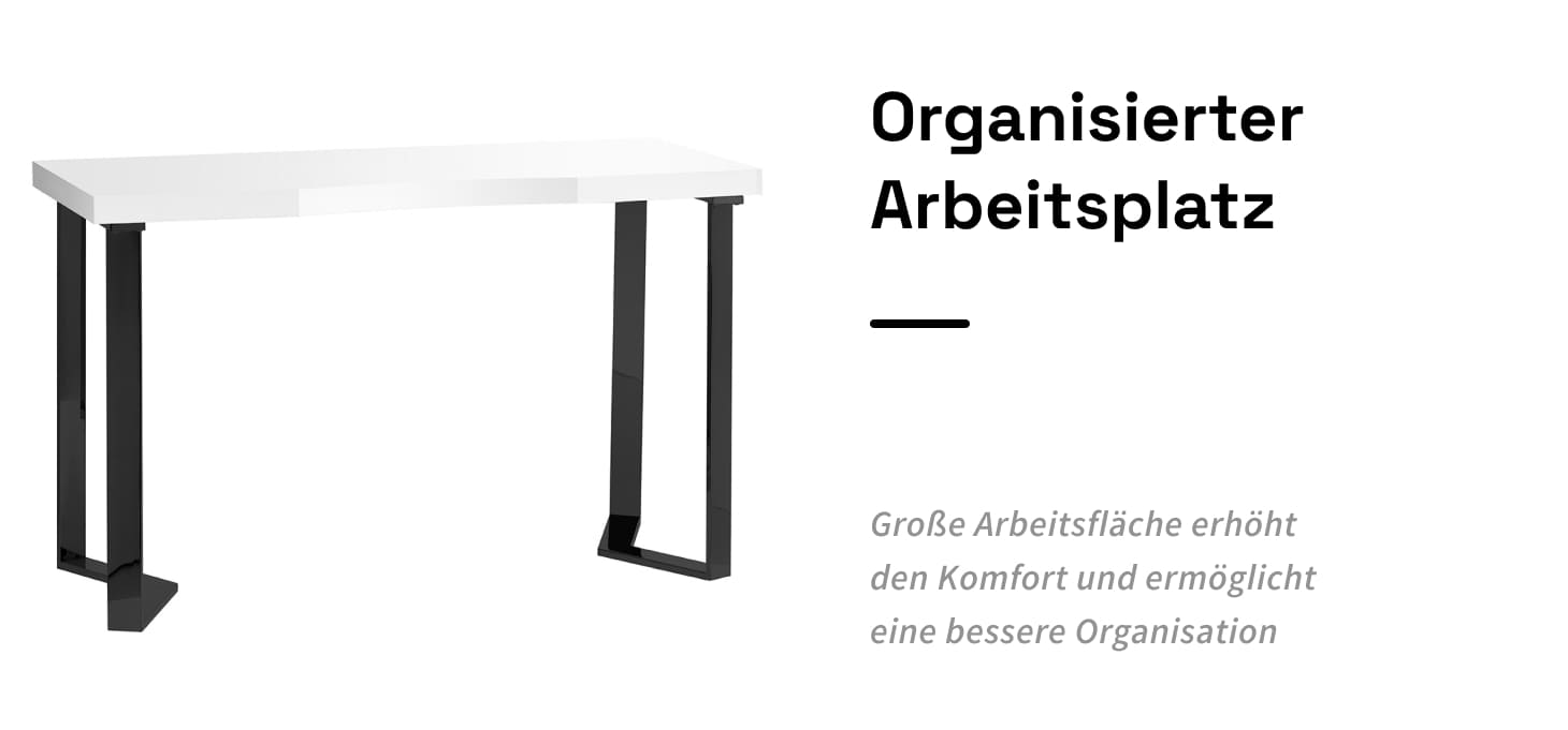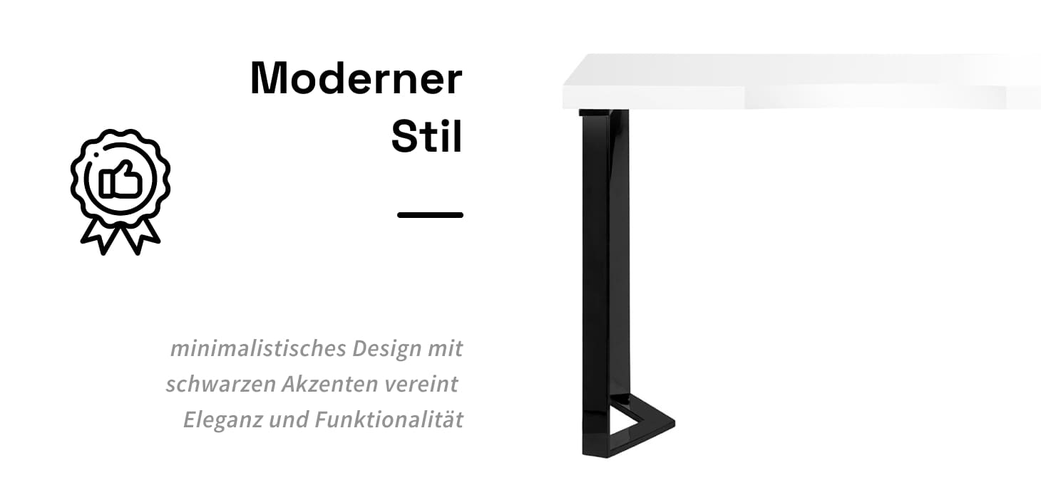Die moderne Form des Kosmetiktisch, die eine weiße Platte mit schwarzenen, geometrischen Beinen kombiniert, verleiht dem Interieur Leichtigkeit und Eleganz. Dank seiner kompakten und dennoch stilvollen Form eignet sich der Kosmetiktisch sowohl für kleine Büros als auch für größere, moderne Innenräume.