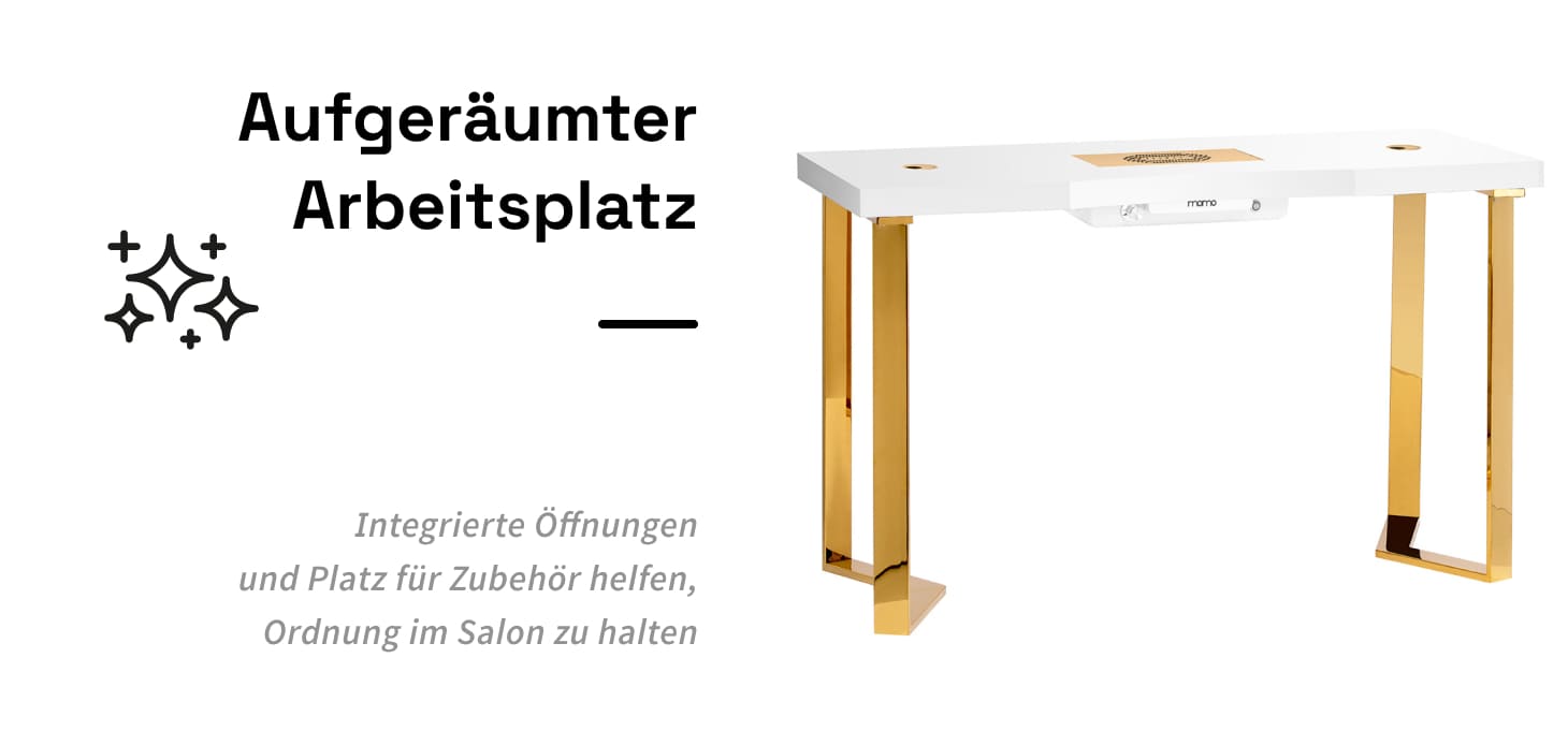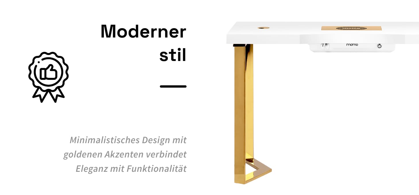 Der Kosmetiktisch Momo 05 ist eine einzigartige Kombination aus Schlichtheit und Stil, die für anspruchsvolle Benutzer entwickelt wurde. Das minimalistische Design mit goldenen Elementen verleiht ihm einen eleganten Charakter. Die glatte, hochglänzende Platte garantiert Komfort bei der täglichen Arbeit im Schönheitssalon.