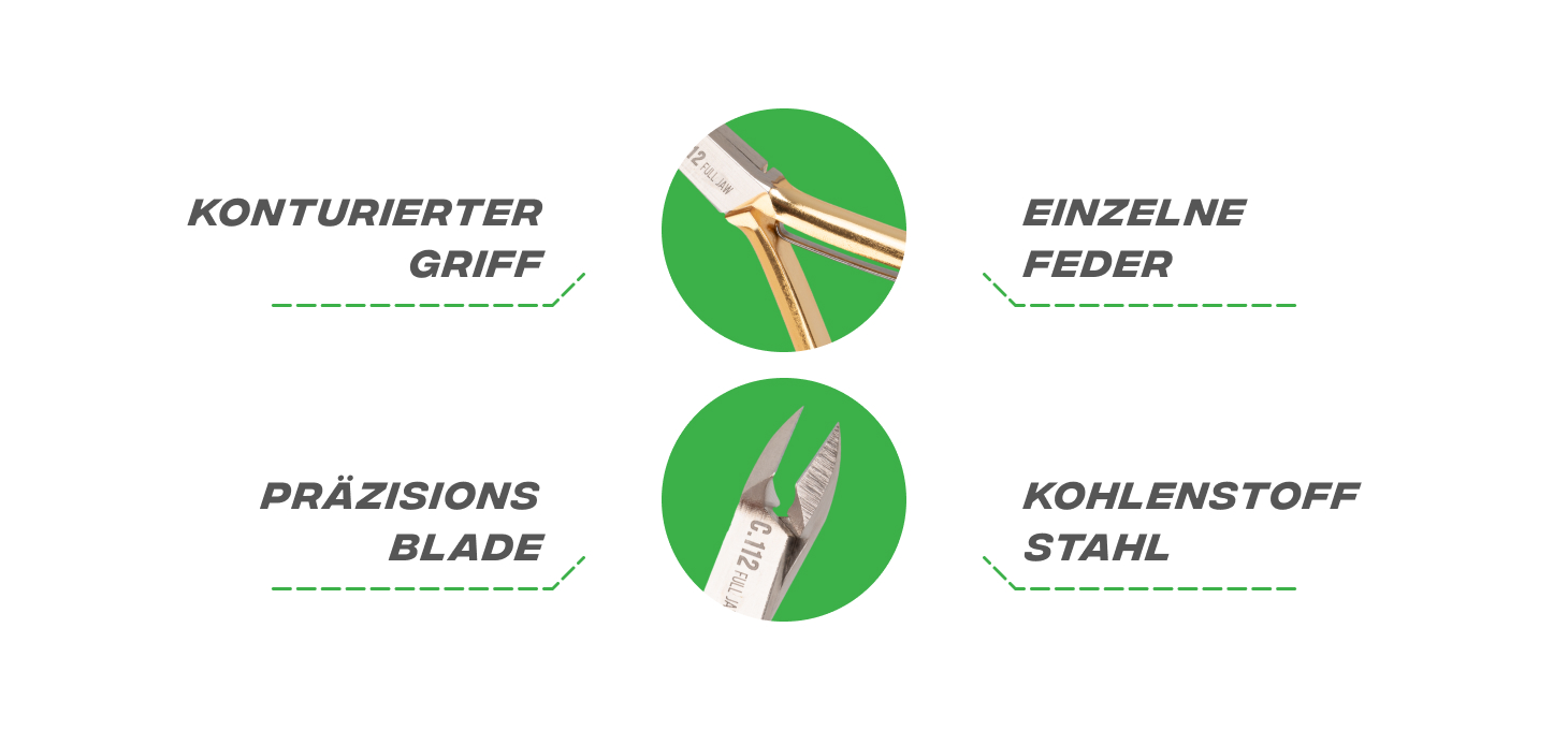 Eine einzige Feder verbindet die Arme der Zange und sorgt für ein angenehmes Gefühl und präzises Schneiden. Die sorgfältige Konstruktion der Feder ermöglicht ein komfortables Arbeiten. Die Form und Größe der Arme sorgen dafür, dass die Zange gut in der Hand liegt, was eine komfortable Benutzung garantiert. Die polierte Oberfläche in Goldtönen verleiht ihr ein elegantes Aussehen, während das Werkzeug gleichzeitig langlebig und leicht zu reinigen ist. Das macht sie zum idealen Werkzeug sowohl für Profis als auch für die häusliche Nagelpflege.