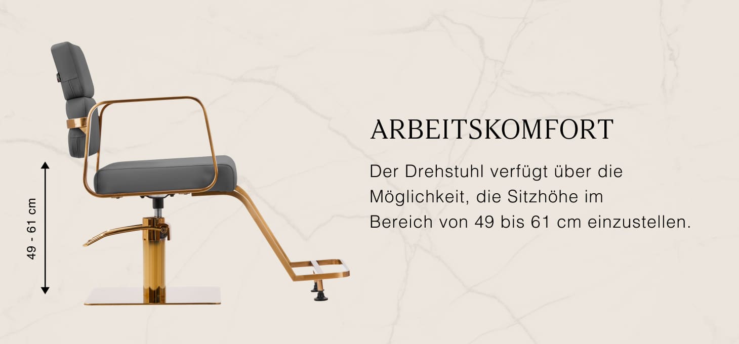 Mit einem langlebigen hydraulischen Lift können Sie das Sitzniveau zwischen 49 und 61 cm verstellen – auch wenn der Kunde auf dem Stuhl sitzt. Es bietet ein ergonomischeres Arbeitserlebnis, da die Sitzhöhe an die Körpergröße des Kunden und des Friseurs angepasst werden kann. Die optisch ansprechende Rückenlehne ermöglicht es Ihnen, eine bequeme Position einzunehmen, die eine hervorragende Rückenstütze bietet, was besonders bei vielen Behandlungsstunden wichtig ist. Ein großes Plus dieses Modells ist das Loch, das zwischen der Rückenlehne und dem Sitz bleibt. Es macht es einfacher, den Salon sauber zu halten, so dass Sie Ihre Haare leicht aus allen Ecken und Winkeln des Stuhls fegen können. Auf diese Weise können Sie die Vorbereitung des Arbeitsplatzes zwischen den Kunden optimieren.