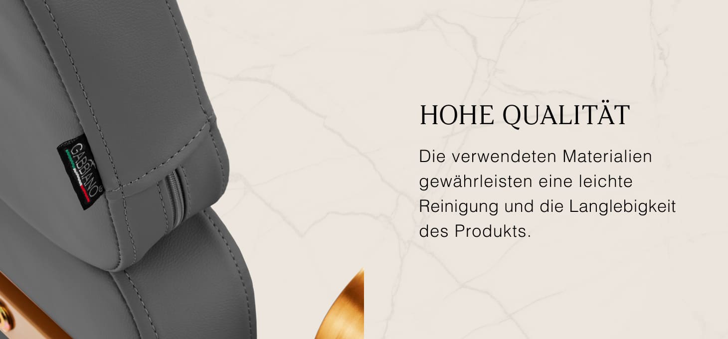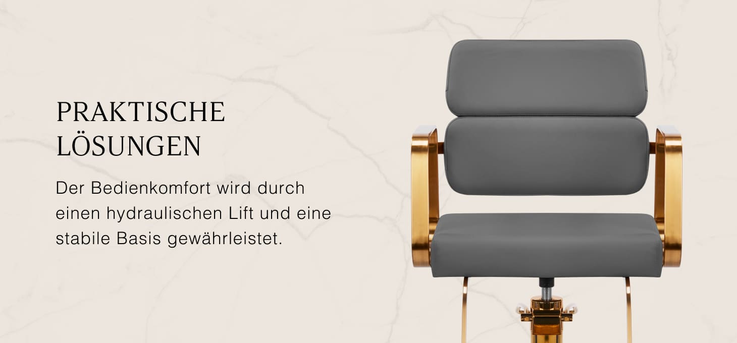 Die Füllung aus strapazierfähigem, verformungsbeständigem Schaumstoff und die Polsterung aus angenehm haptischem Kunstleder sorgen für die Langlebigkeit der Möbel und ihre komfortable Nutzung über einen langen Zeitraum. Außerdem machen sie die Geräte feuchtigkeitsbeständig, langlebig und leicht zu reinigen. Der Bezug in Grautönen verleiht ihm einen einzigartigen Charakter. Die Ausstattung zeichnet sich durch ein modernes Design aus, das den Sessel in vielen professionellen Salons großartig aussehen lässt.