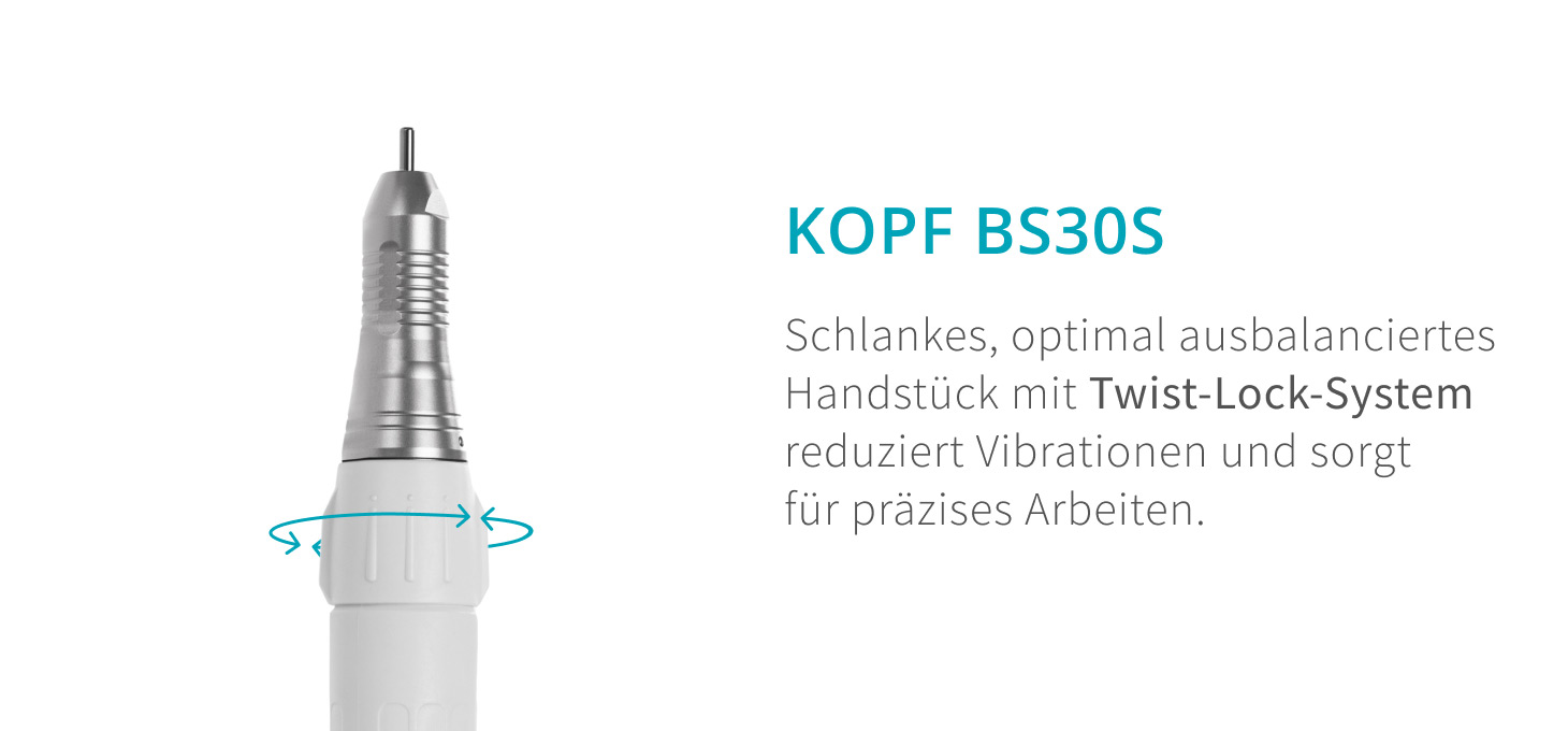 Der schlanke BS30S-Kopf sorgt für einen bequemen Griff und hohe Arbeitspräzision. Ein richtiges Gleichgewicht und die Reduzierung der Vibrationspegel beeinträchtigen den Gebrauchskomfort, auch während langfristiger Behandlungen. Das Twist-Lock-System ermöglicht schnelle und problemlose Wechsel der Schneider, was den Komfort und die Geschmeidigkeit erhöht.
