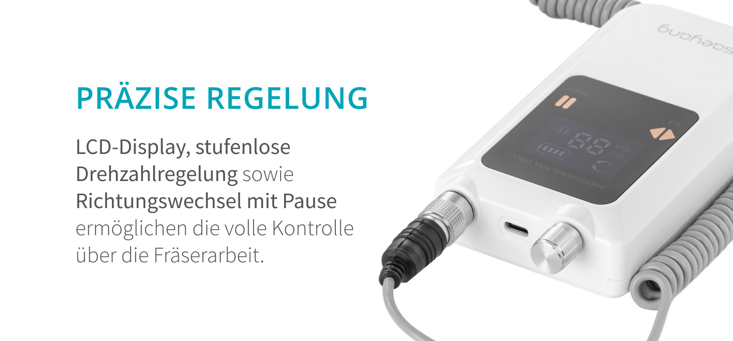 Enthalten: Nagelfräserbasis, Kopf, Netzteil, Silikon-Kopfstand.