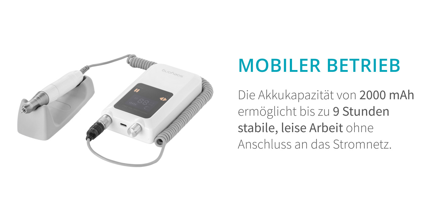 Der eingebaute 2000-mAh-Akku ermöglicht es, bis zu 9 Stunden mit einer einzigen Ladung zu arbeiten. Die Fräsmaschine arbeitet leise, was störende Geräusche eliminiert und sowohl für die ausführende Person als auch für die Kunden Komfort gewährleistet. Darüber hinaus wurde das Gerät mit Blick auf Ergonomie konzipiert – eine bequeme Tastenplatzierung und eine intuitive Bedienung sorgen dafür, dass jeder Eingriff reibungslos abläuft.