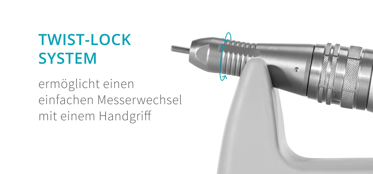 Der funktionale, präzise Kopf liegt perfekt in der Hand, was einen hohen Arbeitskomfort garantiert. Er ist mit einem einfach zu bedienenden Twist-Lock-System ausgestattet, das einen schnellen und reibungslosen Austausch der Messer ermöglicht. Dadurch ist die Arbeit mit dem Gerät extrem einfach und intuitiv, was auch von anspruchsvolleren Benutzern geschätzt wird. Das Element ist richtig ausbalanciert und ergonomisch profiliert, und außerdem wurden Kopfvibrationen reduziert, wodurch selbst viele Arbeitsstunden mit der Fräsmaschine die Hand nicht übermäßig ermüden.