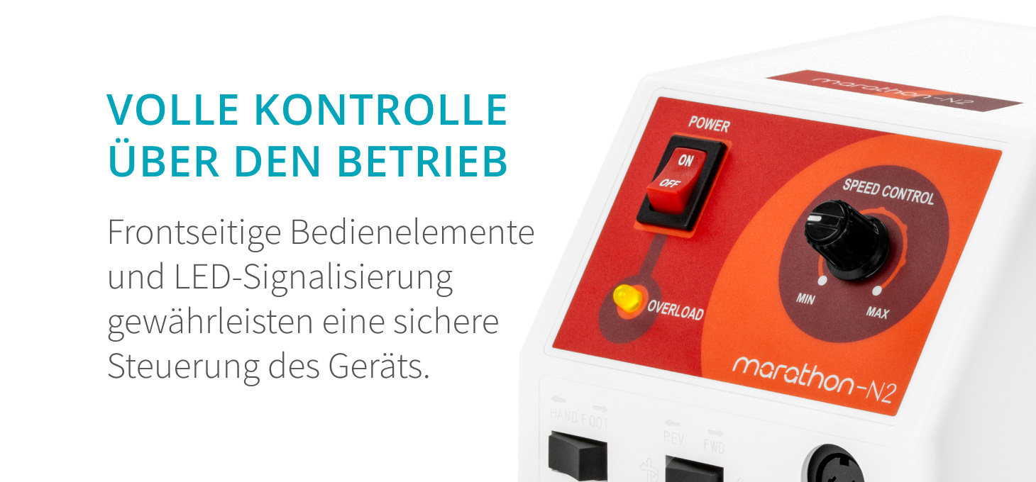 Eine unendlich variable Drehzahlregelung von bis zu 30.000 Umdrehungen pro Minute gewährleistet Flexibilität und Komfort für eine Vielzahl von Behandlungen. Möglichkeit, die Drehung und Steuerung zu ändern – schalten Sie die Vorderseite des Geräts ein. Ein sanfter Rotationswechsel mit eingebauter Pause gewährleistet einen sicheren Übergang zwischen den Arbeiten in beide Richtungen. Überlastungsschutz mit LED-Warnsignal schützt den Motor vor Überhitzung, was eine höhere Betriebssicherheit gewährleistet und Schäden am Gerät verhindert.