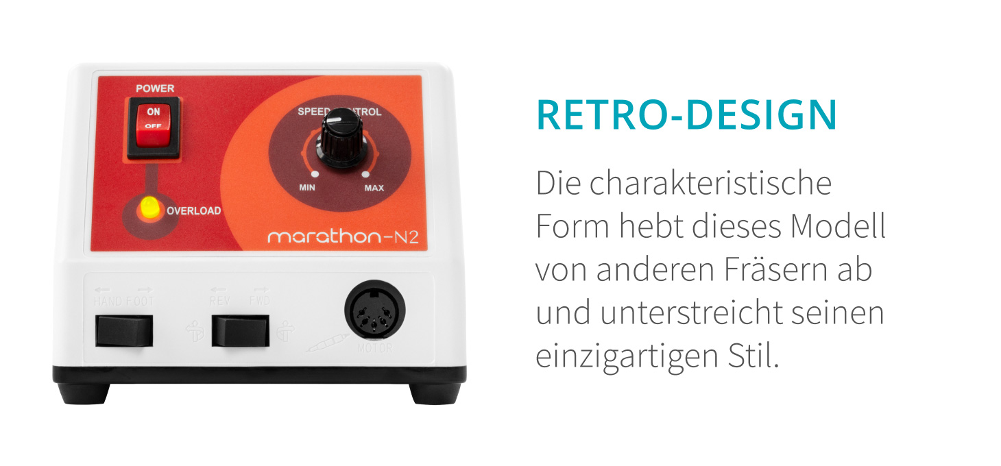 Die Saeyang Marathon N2 Retro- Nagelfräser mit ihren kleinen Abmessungen vereint hohe Funktionalität mit raffinierter Ästhetik. Der Retro-Stil in Weiß- und Orangetönen verleiht dem Gerät ein markantes und auffälliges Aussehen. Zusätzlich ist die Fräsmaschine mit gummiierten Füßen ausgestattet, die eine stabile Position gewährleisten und die Arbeitsplatte vor möglichen Beschädigungen schützen. Die Fräsmaschine ist perfekt für den Alltag und bietet Komfort bei jeder Maniküre und Pediküre.