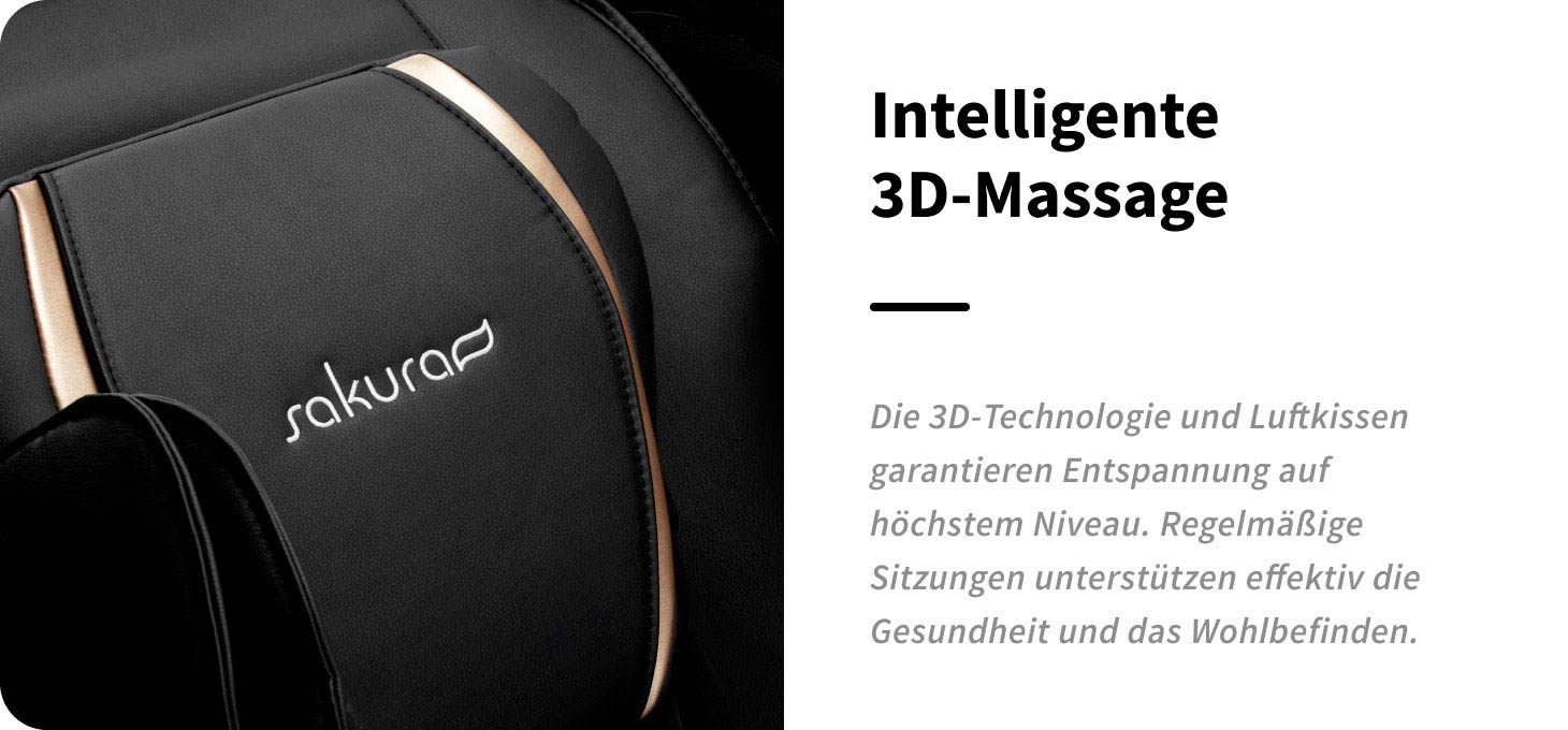 Der Massagesessel Sakura Maximus 809 mit fortschrittlicher 3D-Massage sorgt für ganzheitliche Entspannung und hohen Komfort. Durchdachte Funktionen gewährleisten eine intensive und zugleich wohltuende Massage. Das intelligente Körperscansystem, die 3D-Technologie, präzise arbeitende Massageköpfe sowie ein Luftkissen-System sorgen für effektive Muskelentspannung, tiefe Erholung und innere Ruhe. Eine ideale Lösung sowohl für aktive Menschen als auch für Personen, die viele Stunden im Sitzen verbringen – für eine tägliche Portion Entspannung auf höchstem Niveau. Regelmäßige Massagesitzungen fördern die Durchblutung, helfen Muskelverspannungen und Müdigkeit zu reduzieren und senken effektiv das Stressniveau, was sich positiv auf das tägliche Wohlbefinden und die Lebensqualität auswirkt.