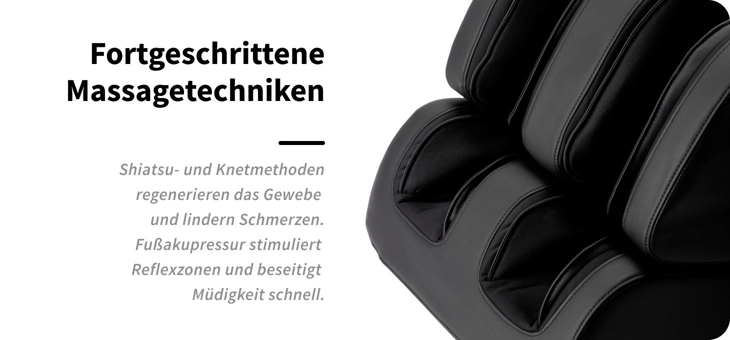 Die eingesetzten Massagetechnologien basieren auf präzise abgestimmten und sich ergänzenden Techniken wie Kneading (Kneten), Knocking (Klopfen), Tapping (leichtes Klopfen) sowie Shiatsu. Ihre vielfältigen Kombinationen ermöglichen eine effektive Bearbeitung des Muskelgewebes, unterstützen die natürlichen Regenerationsprozesse des Körpers und helfen, Verspannungen sowie Schmerzbeschwerden zu reduzieren. Zusätzlich nutzt das integrierte Fußmassagegerät die Akupressur-Technik und wirkt gezielt auf zentrale Reflexzonenpunkte. Der präzise Druck fördert eine tiefe Entspannung und reduziert wirksam das Gefühl müder Füße.