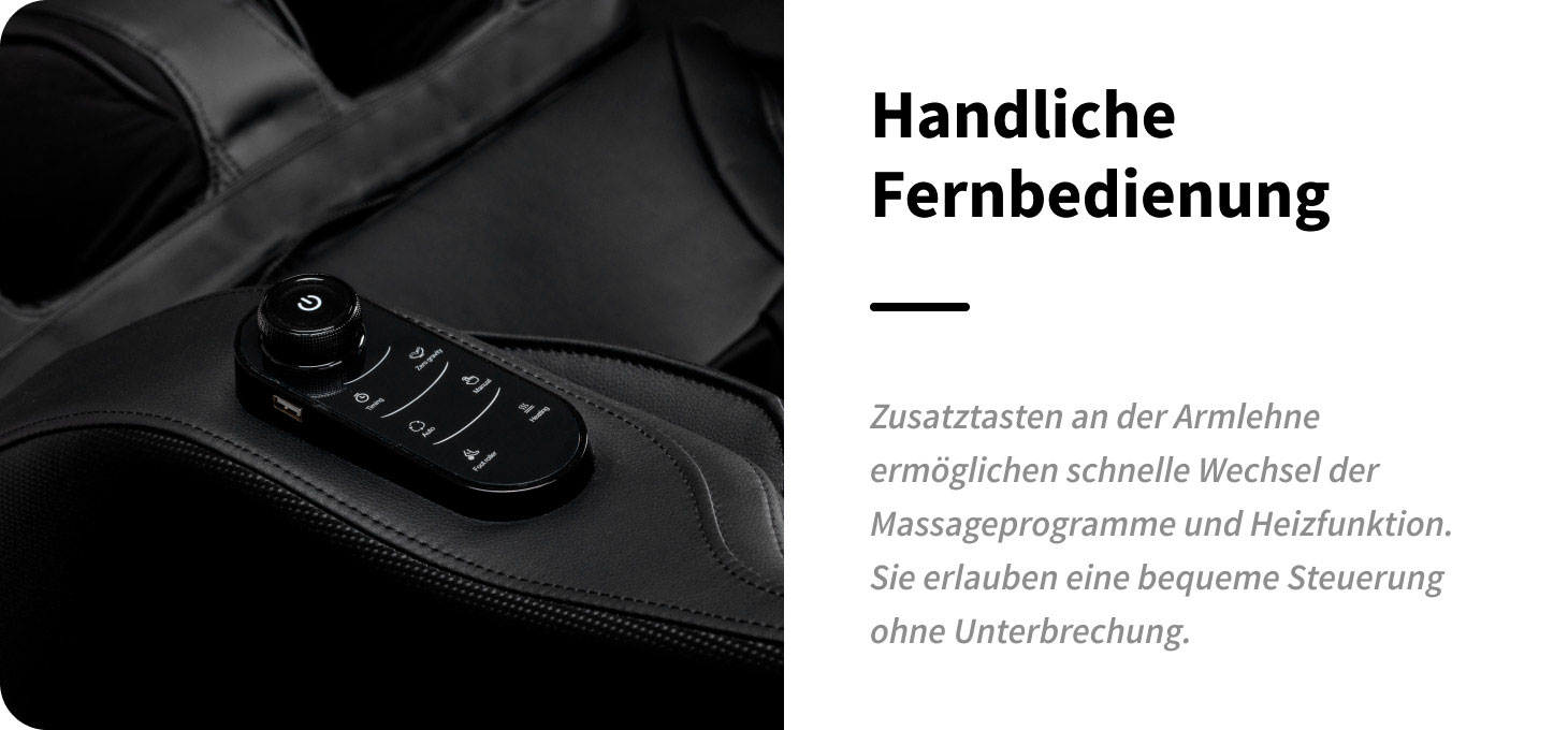 Für noch mehr Komfort ist der Sessel mit zusätzlichen Bedientasten an der linken Armlehne ausgestattet. Die integrierte Schnellsteuerung bietet direkten Zugriff auf die wichtigsten Funktionen, ohne dass das Hauptpanel verwendet werden muss. So kann der Nutzer bequem die Massageart wechseln, die Fußmassage starten, die Heizfunktion aktivieren oder die Zero-Gravity-Funktion einschalten und jederzeit Komfort sowie Intensität individuell steuern.