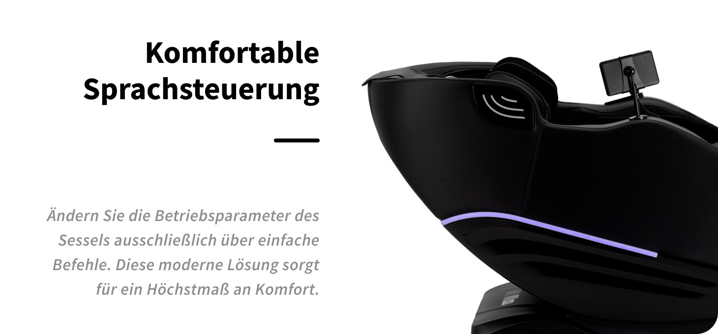 Der Massagesessel verfügt über eine Sprachsteuerungsfunktion, die eine komfortable Bedienung ohne Einsatz der Hände ermöglicht. Mit einfachen Sprachbefehlen kann die Massage gestartet oder beendet, ein Programm ausgewählt sowie die Luftkissenfunktion und die Intensität angepasst werden. Diese Lösung erhöht den Nutzungskomfort, ermöglicht vollständige Entspannung und erlaubt es, sich ganz auf die Erholung zu konzentrieren – ohne nach dem Bedienpanel greifen zu müssen.