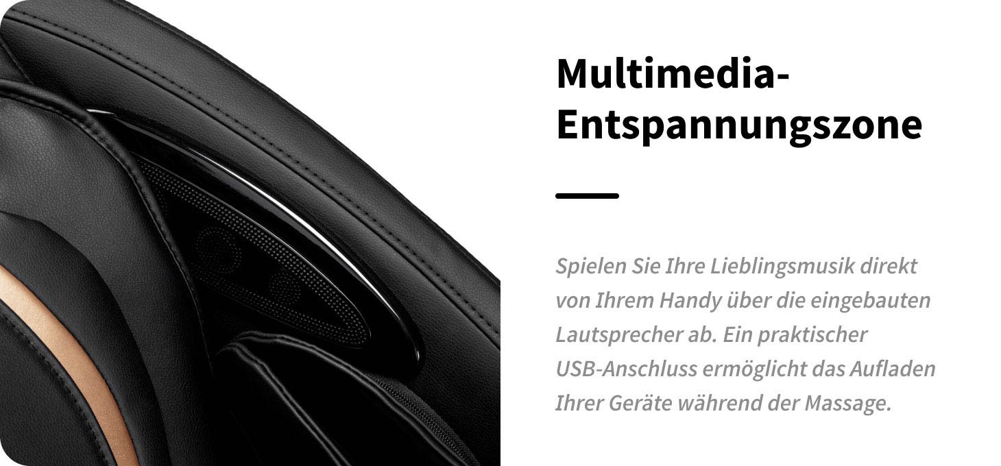 Für noch mehr Komfort kann der Massagesessel über Bluetooth mit dem Smartphone verbunden werden, sodass während der Sitzung entspannende Lieblingsmusik abgespielt werden kann. Ruhige Klänge helfen, den Geist zu beruhigen, das Wohlbefinden zu steigern und den Körper vollständig zu entspannen. Darüber hinaus ist der Sessel mit einem USB-Anschluss ausgestattet, über den mobile Geräte während der Massage aufgeladen werden können.
