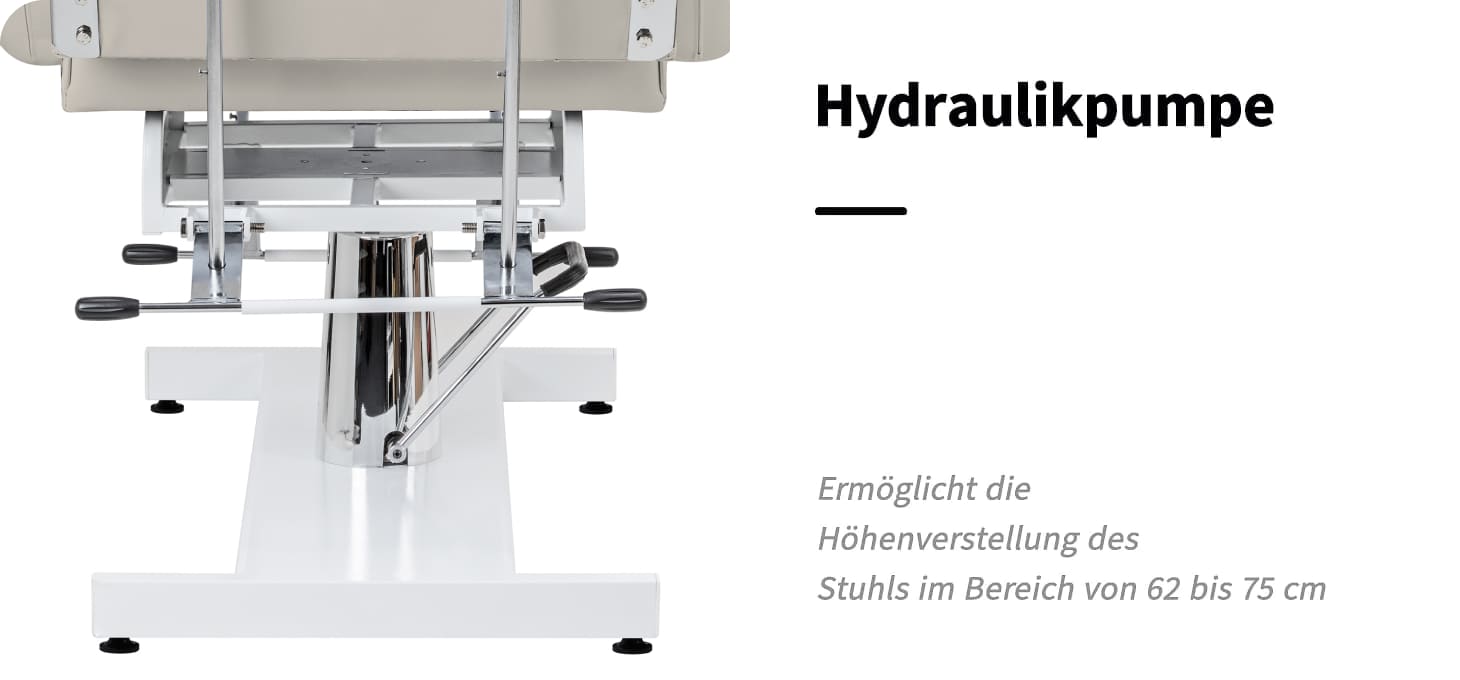 Die Höhe des Sitzes kann im Bereich von 62-75 cm eingestellt werden, ohne die Hände mit einer Hydraulikpumpe zu verwenden. Dies ermöglicht eine komfortable Nutzung der Geräte für Personen unterschiedlicher Körpergröße und ermöglicht die Anpassung an die individuellen Bedürfnisse sowohl des Kunden als auch der durchführenden Person. Der verwendete Mechanismus ist sehr langlebig und zuverlässig. Dank des Lochs in der Kopfstütze, das unter einem richtig profilierten Kissen versteckt ist, eignet sich der Stuhl auch perfekt für Behandlungen am Rücken, wie Massagen.