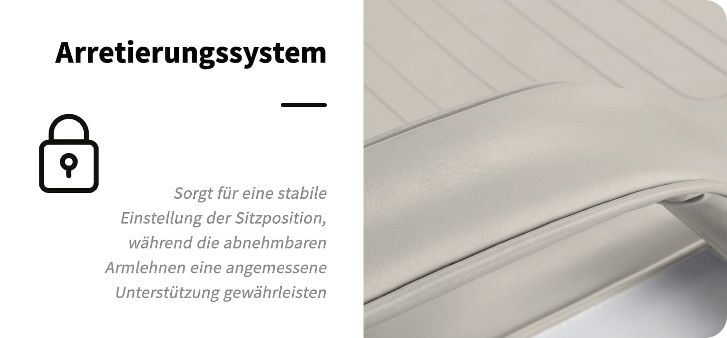 Das Set beinhaltet: Sitz mit Rückenlehne und Fußstütze, Armlehnensatz, Kissen für das Loch, Basiselemente mit Betätiger, Montagesatz.