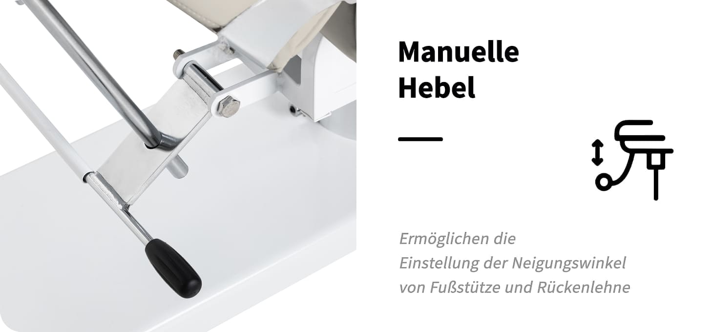 Mit Hilfe spezieller Hebel ist es möglich, die Winkel, in denen sich Fußstütze und Rückenlehne befinden, stufenlos einzustellen. Dies ermöglicht eine optimale Anpassung der Einstellungen an die individuellen Bedürfnisse, für eine korrekte und bequeme Behandlung und einen Bedienkomfort. Der Stuhl kann auf die Position einer Couch heruntergeklappt werden, was seine Funktionalität sowohl bei Gesichts- als auch bei Körperbehandlungen deutlich erhöht.
