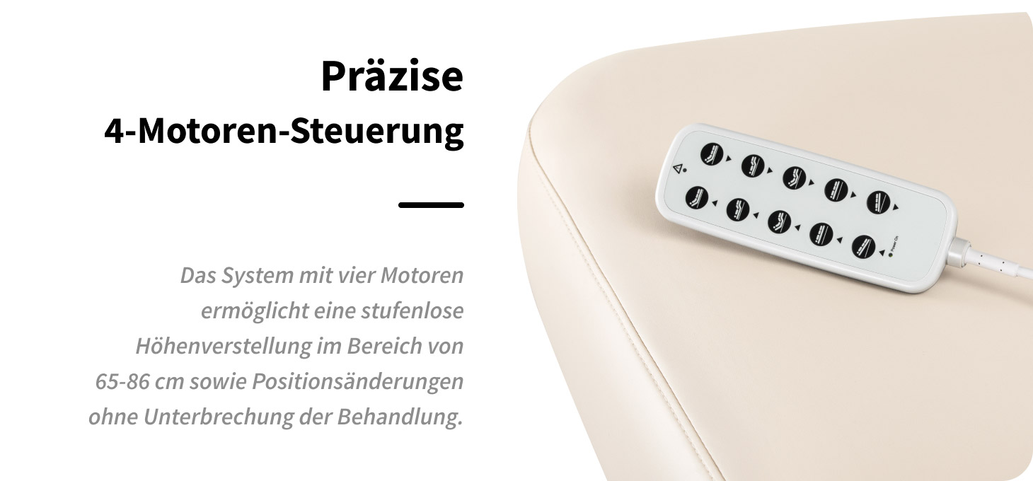 Die intuitive Fernbedienung ermöglicht eine stufenlose Einstellung in vier Ebenen – Höhe, Neigungswinkel der Rückenlehne, Fußstütze und Wiegefunktion. Die elektrische Höhenverstellung im Bereich von 65-86 cm und die präzise Änderung der Neigungswinkel ermöglichen eine perfekte Anpassung der Liege an die Art der durchgeführten Behandlung. Der große Einstellbereich erleichtert die Einhaltung einer ergonomischen Arbeitsposition – unabhängig von der Körpergröße des Spezialisten oder den Besonderheiten des Eingriffs. Die Möglichkeit, Rückenlehne und Fußstütze gleichzeitig mit einem einzigen Knopf zu verstellen, ermöglicht eine schnelle Einstellung der Sitz-, Liege- oder Halbliegeposition – ohne den Eingriff unterbrechen zu müssen. Die stufenlose Verstellung fördert die Ergonomie der Arbeit und erhöht den Komfort für den Kunden in jeder Phase des Eingriffs.