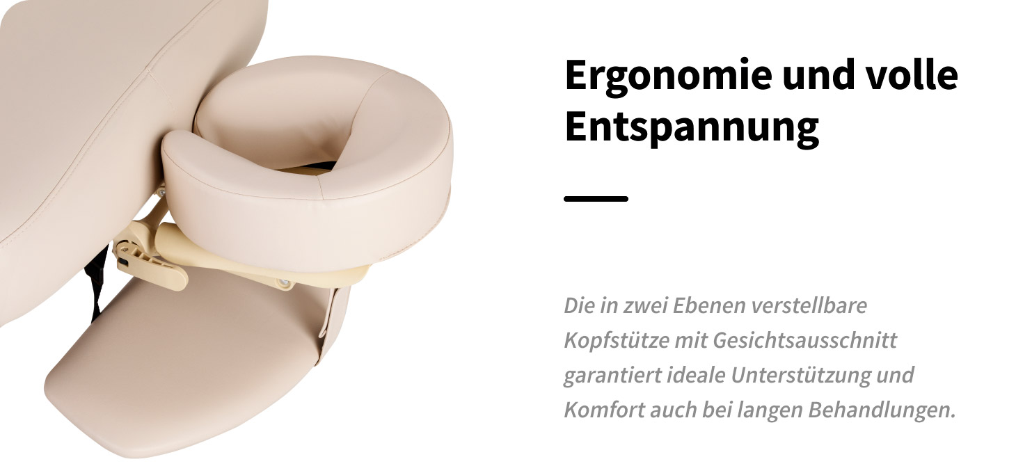 Die im Lieferumfang enthaltene ergonomische Kopfstütze mit Gesichtsausschnitt sorgt für eine bequeme Positionierung des Kopfes bei Behandlungen auf dem Rücken, dem Bauch und in Rückenlage. Die richtige Stütze erhöht den Komfort des Kunden auch bei längeren Behandlungen und fördert die vollständige Entspannung. Das Element verfügt über eine Neigungsverstellung in zwei Ebenen, wodurch die Einstellung präzise an die Art der Behandlung und die individuellen Bedürfnisse angepasst werden kann.